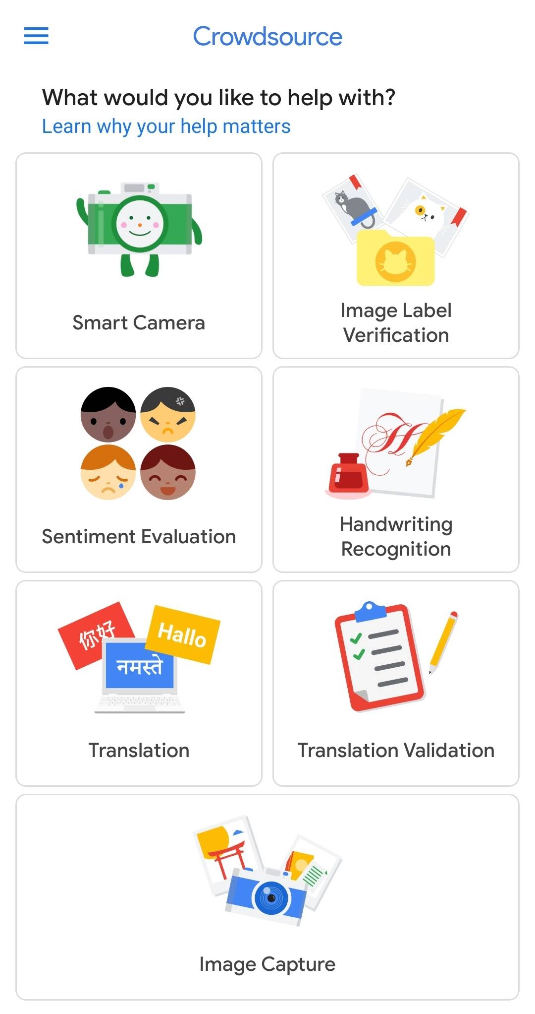 Google Crowdsource คือ แอพที่สร้างขึ้นมาเพื่อขอให้ User จากทั่วโลก ที่มาจากหลากหลายเชื้อชาติ หลากหลายภาษา มาช่วยกันปรับปรุงฐานข้อมูลด้าน Machine Learning เพื่อพัฒนา Product ต่างๆของ Google ไม่ว่าจะเป็น Google Photos, Google Maps, Google Translate และอื่นๆอีกมากมาย ให้ตอบสนองการผู้ใช้งานได้ดียิ่งขึ้น