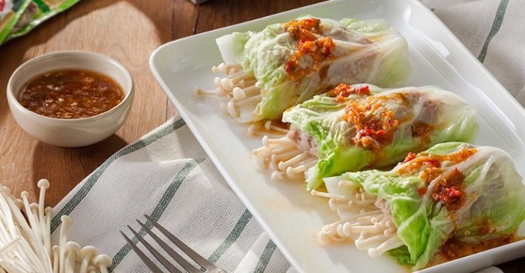 "ผักกาดขาวม้วนยัดไส้หมูนุ่มเห็ดเข็มทอง+น้ำจิ้มซีฟู้ด"