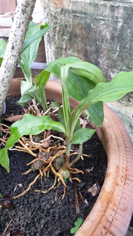 ใครก็ไม่รู้เอามาวางไว้ในกระถาง เหมือนมันจะเป็นพวกกล้วยไม้ รากที่เห็นน่าจะเป็นรากอากาศ เพราะไม่ได้ฝังไว้ในดินแต่มันก็ไม่ตาย