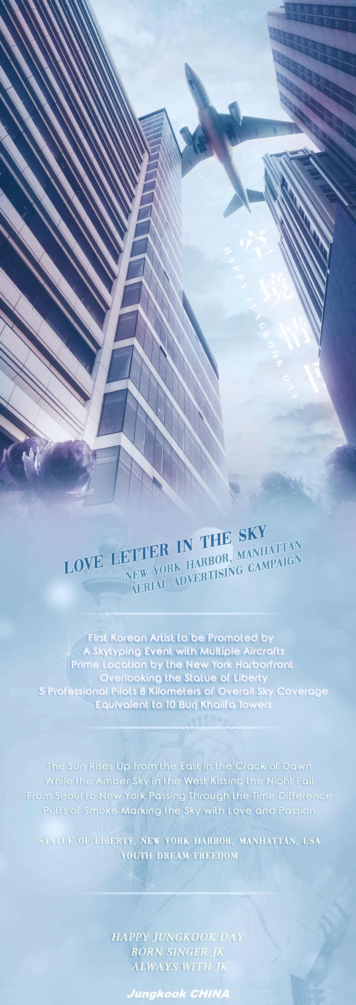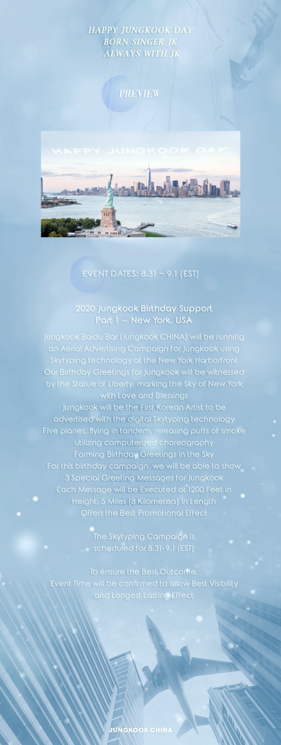 บ้านบาร์จองกุกเตรียมทำโปรเจคเฉลิมฉลองวันเกิดให้จองกุก ด้วยการใช้เครื่องบิน 5 ลำ เขียนข้อความฉลองวันเกิดบนน่านฟ้าของนิวยอร์กและแมนฮัตตั้น,USA แบบ "Skytyping" แสดงเอฟเฟ็คควันที่ความสูง 1,200 ฟุต ความยาว 8 กิโลเมตร เพื่อโปรโมทในวันเกิดของจองกุกปีนี้ และจองกุกยังเป็นเป็นศิลปินเกาหลีคนแรกที่ได้รับการโปรโมทแบบ Skytyping อีกด้วย