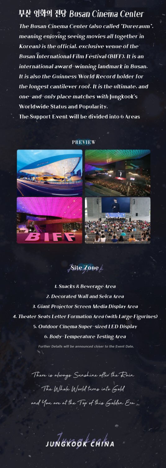 โปรเจคนี้จะจัดขึ้นที่บ้านเกิดจองกุก เมืองปูซาน,เกาหลีใต้ จะเป็นการแสดงมีเดียของของจองกุกที่โรงภาพยนตร์ปูซาน (Busan Cinema Center) จะมีทั้งหมด 6 อีเวนท์ ในพื้นที่ 32,137 ตารางเมตร เป็นที่ที่จัดเทศกาลภาพยนตร์นานาชาติ ซึ่งเป็นสถานที่สนับสนุนที่ใหญ่ที่สุดในประวัติศาสตร์ และจองกุกเป็นศิลปินเกาหลีคนที่แรก