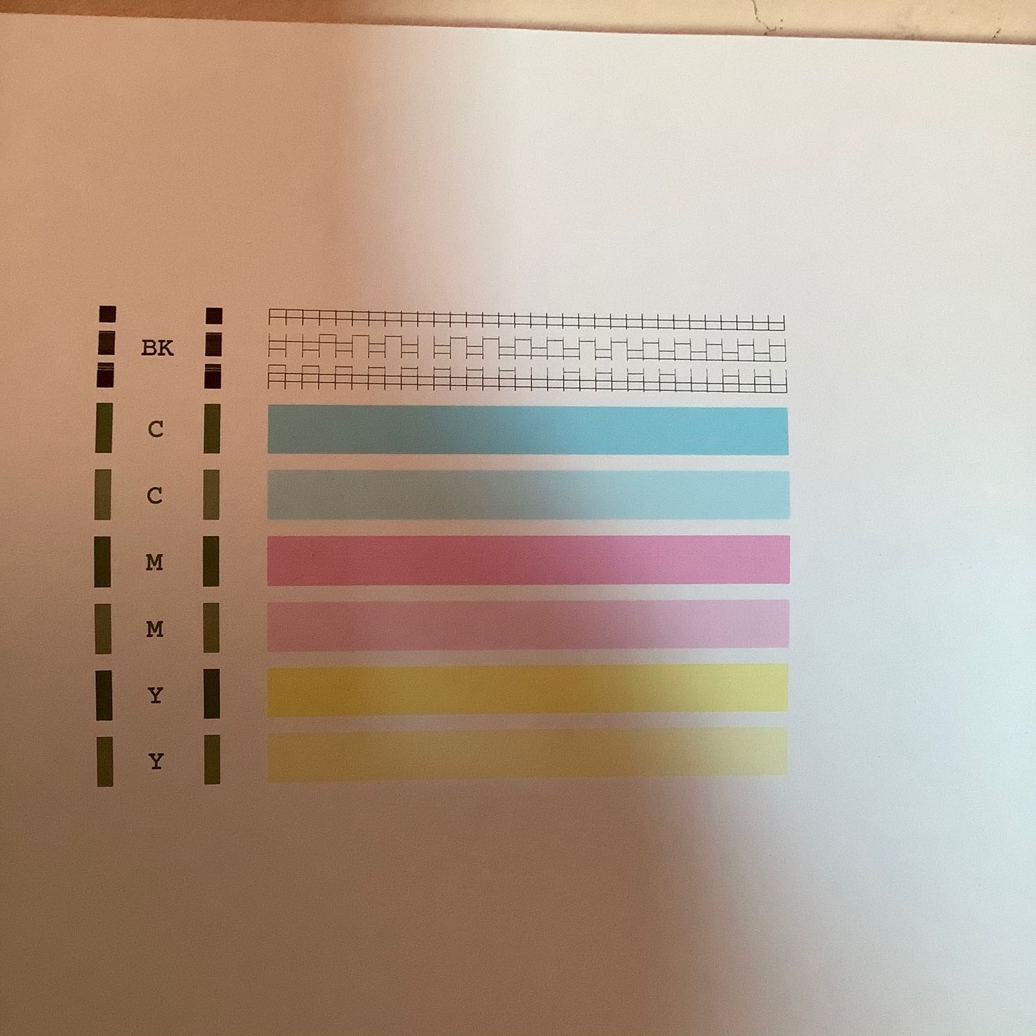 อันนี้ไม่ได้มีการเติมสีในแท้งค์ หรือว่าเติมสีผิดนะครับ ปกติก็ใช้งานได้เรื่อยๆ อยู่ๆ ก็ปริ้นแล้วสีเพี้ยน เลยลองปริ้นแผ่นทดสอบ ออกมา ตรงตำแหน่งสีฟ้า Cyan กลายเป็น