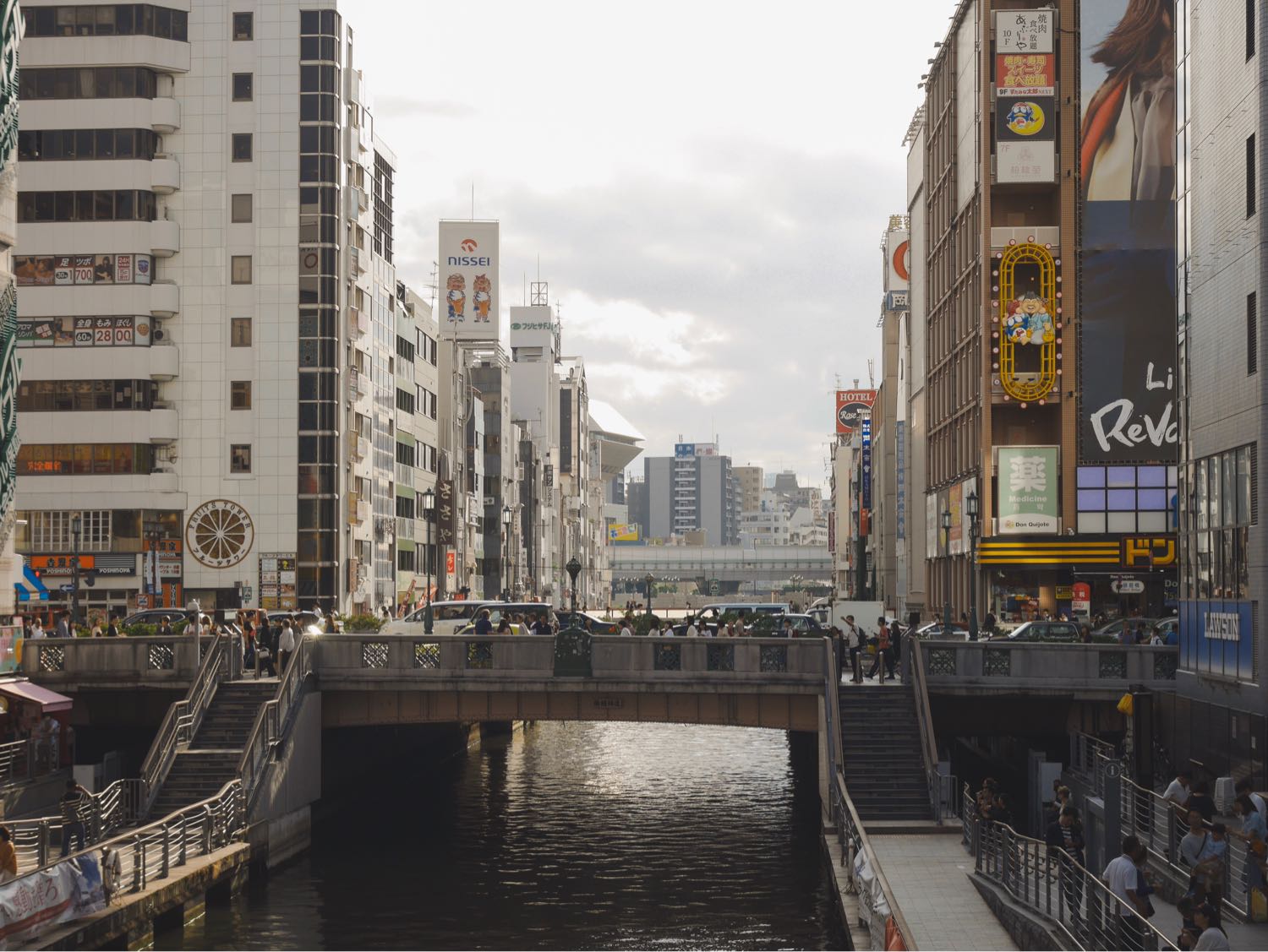 มองมาอีกฝั่งของป้ายกูลิโกะ ที่เห็นน้ำไหลผ่านตามทางนี้ จะมีเรือที่รับนักท่องเที่ยวได้นั่งชมความวุ่นวายและแสงไฟที่สวยงามของย่านนี้ด้วย