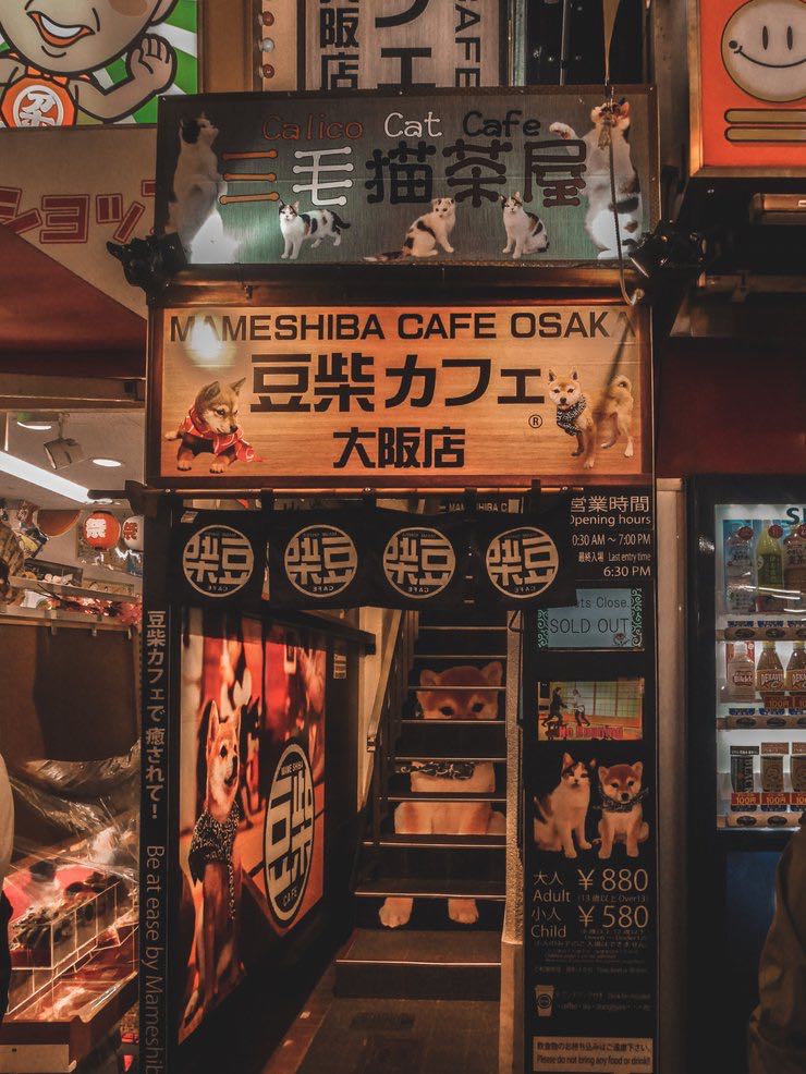 เราเดินไปสักพักสะดุดกับป้ายคาเฟ่หมาชิบะ ชื่อร้าน Mameshiba Cafe Osaka