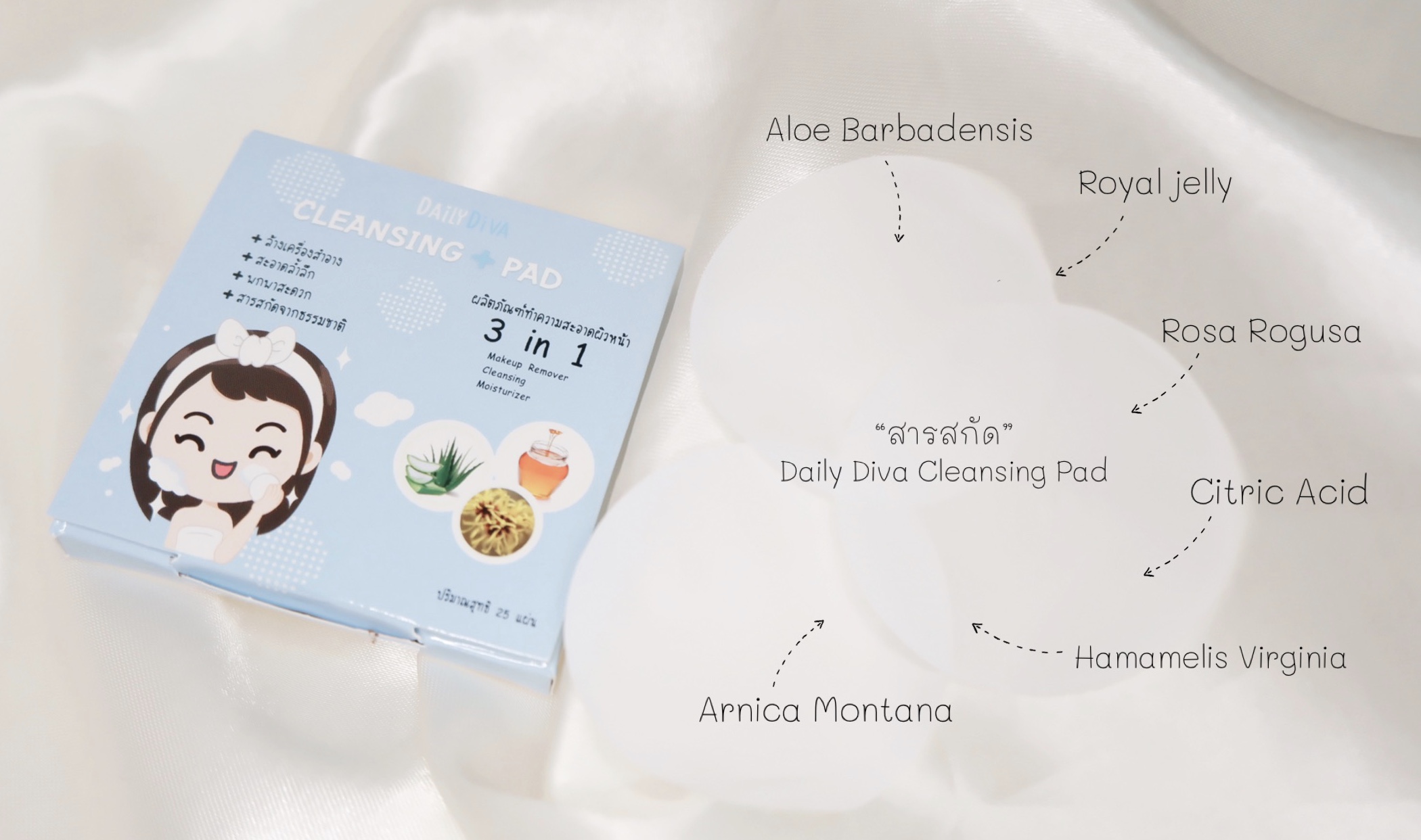 Daily Diva Cleansing Pad เค้าเป็นคลีนซิ่งแผ่นที่มาในรูปแบบ 3 in 1 เลยค่ะ เป็นทั้ง Make up Remover, Cleansing และ Moisturize เลยค่ะ