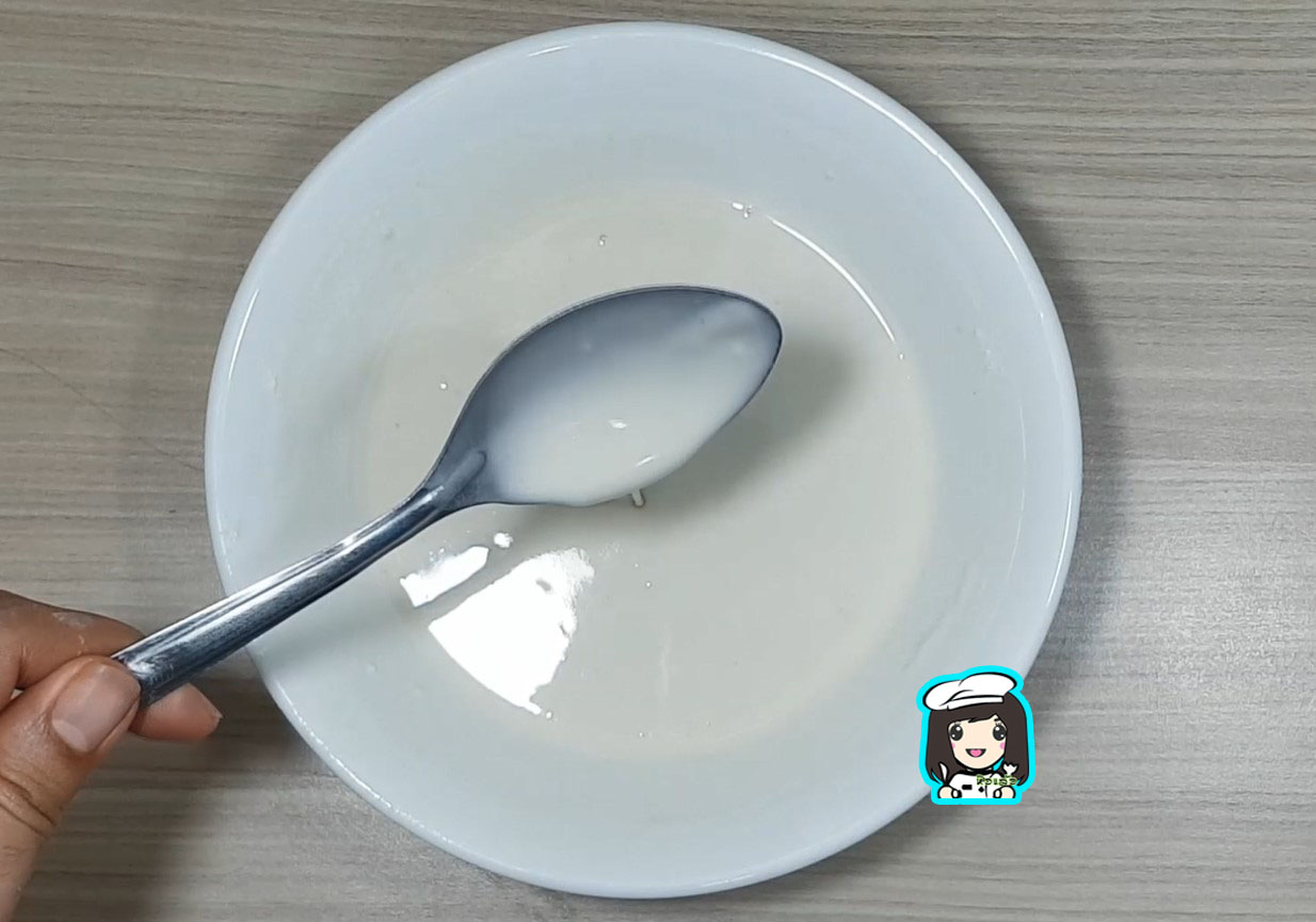 2.ผสมแป้งกับน้ำโซดาเย็นจัด คนให้แป้งเนื้อเนียนละลายจนไม่เป็นเม็ดแป้ง