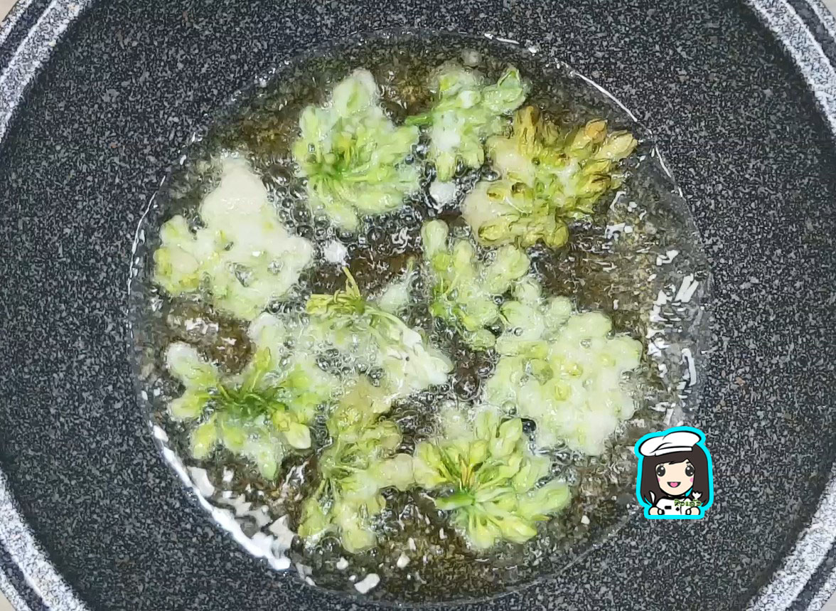 3.ตั้งกระทะใส่น้ำมันพืช กะให้ท่วมผักเวลาทอด เริ่มร้อนนำดอกขจรชุบแป้งใส่ลงกระทะ ทอดด้วยไฟกลางจนเริ่มเหลืองอ่อน ตักขึ้นซับน้ำมัน