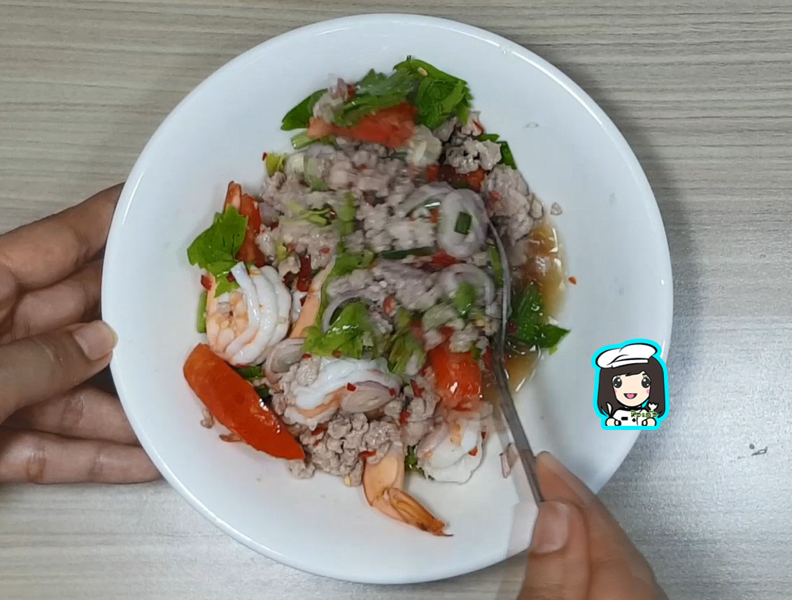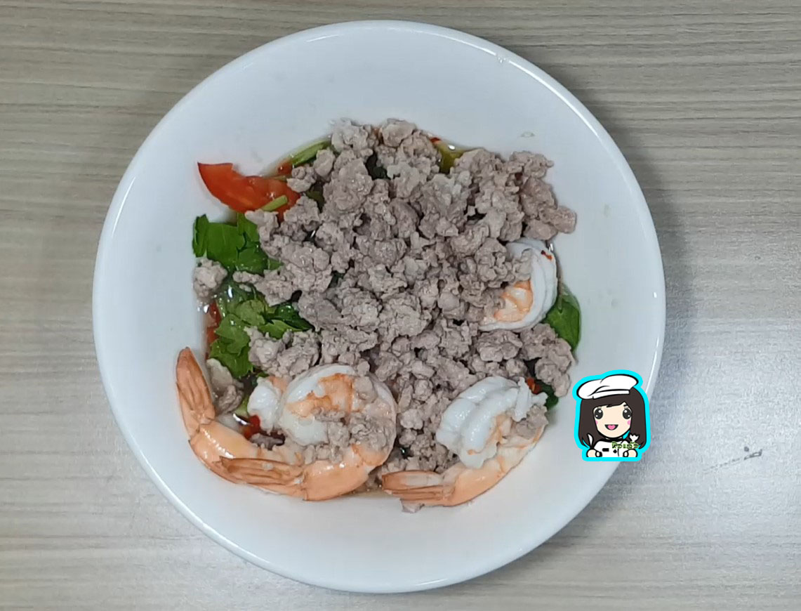 4.ใส่น้ำปลา น้ำตาลทรายลงในชาม คนให้ละลาย เติมน้ำมะนาว พริกสับ หมูสับรวน กุ้งลวก มะเขือเทศ ต้นหอมขึ้นฉ่ายหั่นท่อน คลุกเคล้าให้เข้ากัน โรยหน้าด้วยถั่วทอดบุบหยาบ ทานคู่กับผักทอด