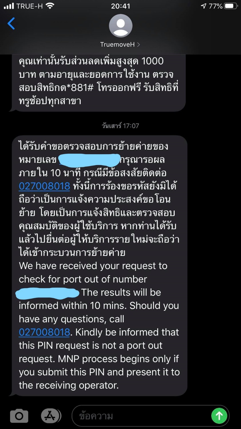 ซึ่งพนักงานทรูก็เอาโทรศัพท์ผมไป แล้วก็เขียนรหัสใส่กระดาษมาให้ผม (ซึ่งกระดาษอันนี้อยู่ที่พนักงาน AIS แล้วนะครับ) ซึ่งที่ผมสงสัยก็คือ ข้อความที่จะส่งรหัสย้ายค่ายเบอร์เดิมไม่ถูกส่งมาที่ข้อความผมเหมือนของแฟนผม (ผมกับแฟนไปย้ายค่ายเบอร์เดิมพร้อมกัน แต่ของแฟนเป็น DTAC พอกดรหัสไป ทางนั้นก็ส่งข้อความเป็นรหัสย้ายค่ายมาให้)