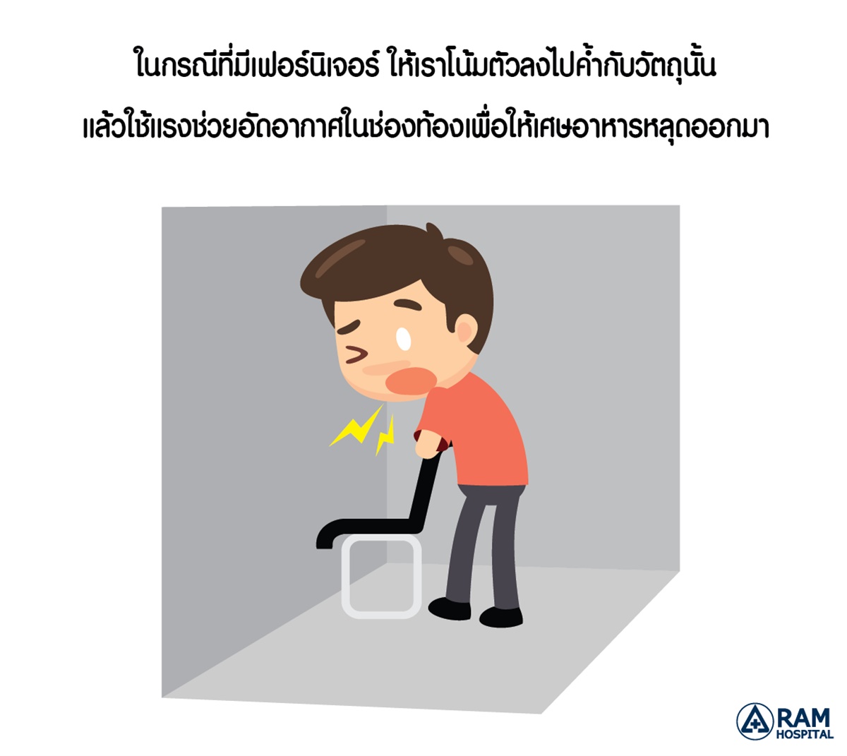 ในกรณีที่มีเฟอร์นิเจอร์ตำแหน่งที่ใกล้เคียงกับช่องท้องเรา เช่นโต๊ะ, เก้าอี้, เคาน์เตอร์ ให้เราโน้มตัวลงไปค้ำกับวัตถุนั้น แล้วใช้แรงกดช่วยอัดอากาศในช่องท้องเพื่อดันเศษอาหารให้หลุดออกมาได้ เพราะบางกรณี ถ้าทุบท้องตัวเองอย่างเดียว เราอาจจะหมดแรงก่อนที่เศษอาหารจะหลุดออกมาได้ ข้าวของพวกนี้สามารถช่วยเรายามฉุกเฉินได้นะ