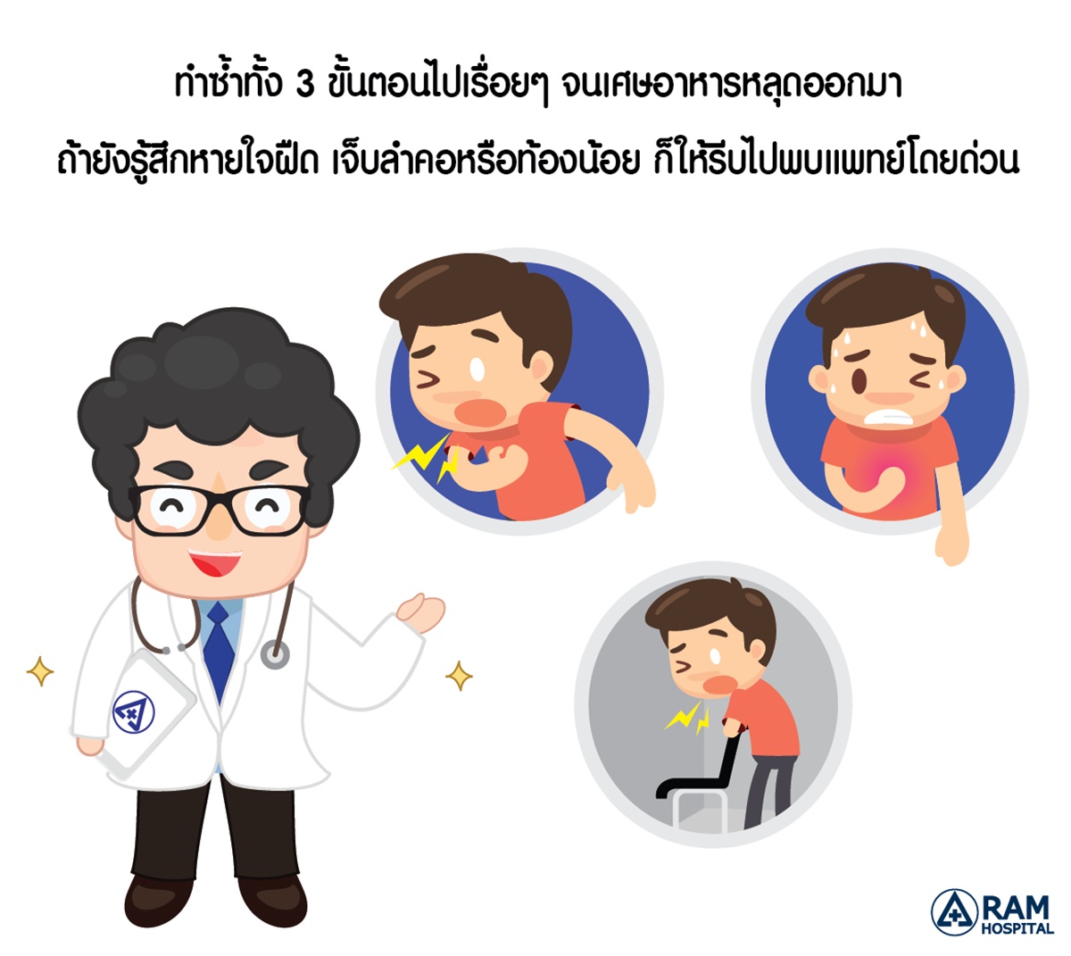 ทำซ้ำทั้ง 3 ขั้นตอนนี้ไปเรื่อยๆ จนเศษอาหารหลุดออกมา ถ้าเศษอาหารหลุดออกมาแล้วอาการก็จะค่อยๆ ดีขึ้นเอง แต่ถ้ายังรู้สึกหายใจฝืด หรือเจ็บลำคอหรือท้องน้อย ก็ให้รีบไปพบแพทย์โดยด่วน