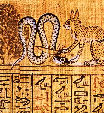 .........รูปภาพ แมว ฆ่า งู แมวเป็นศัตรูทางธรรมชาติกับงู ดังนั้นทุกบ้านของคนอียิปส์จะเลี้ยงแมว เพื่อ ฆ่าหนูและฆ่าแมว ในยามราตรี