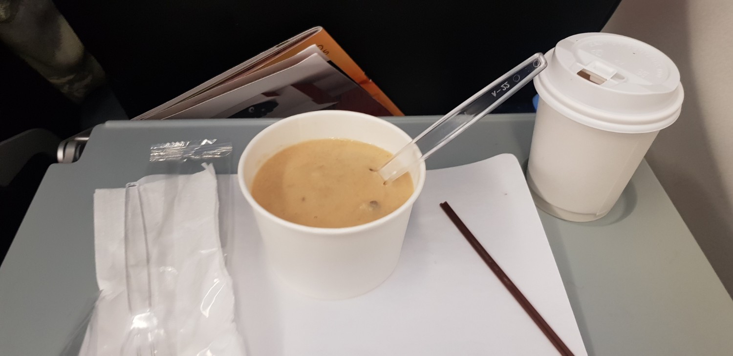 ตื่นมาก็มีอาหารมาขาย อยากกินข้าวไก่เทอริยากิ ก็หมด เลยสั่งซุปเห็ดกับโกโก้ร้อน หวังว่ามันจะทำให้อาการเมาเครื่องดีขึ้น แต่ก็ไม่เลย หนักกว่าเดิมอีกของเก่าก็จะออก ของใหม่ก็ยัดไม่เข้า เสียดายเงินแงแงแงงแง เหลือเยอะจนคุณสจ๊วตถามว่า ไม่ทานเลยหรอครับ ไม่อร่อยหรอครับ