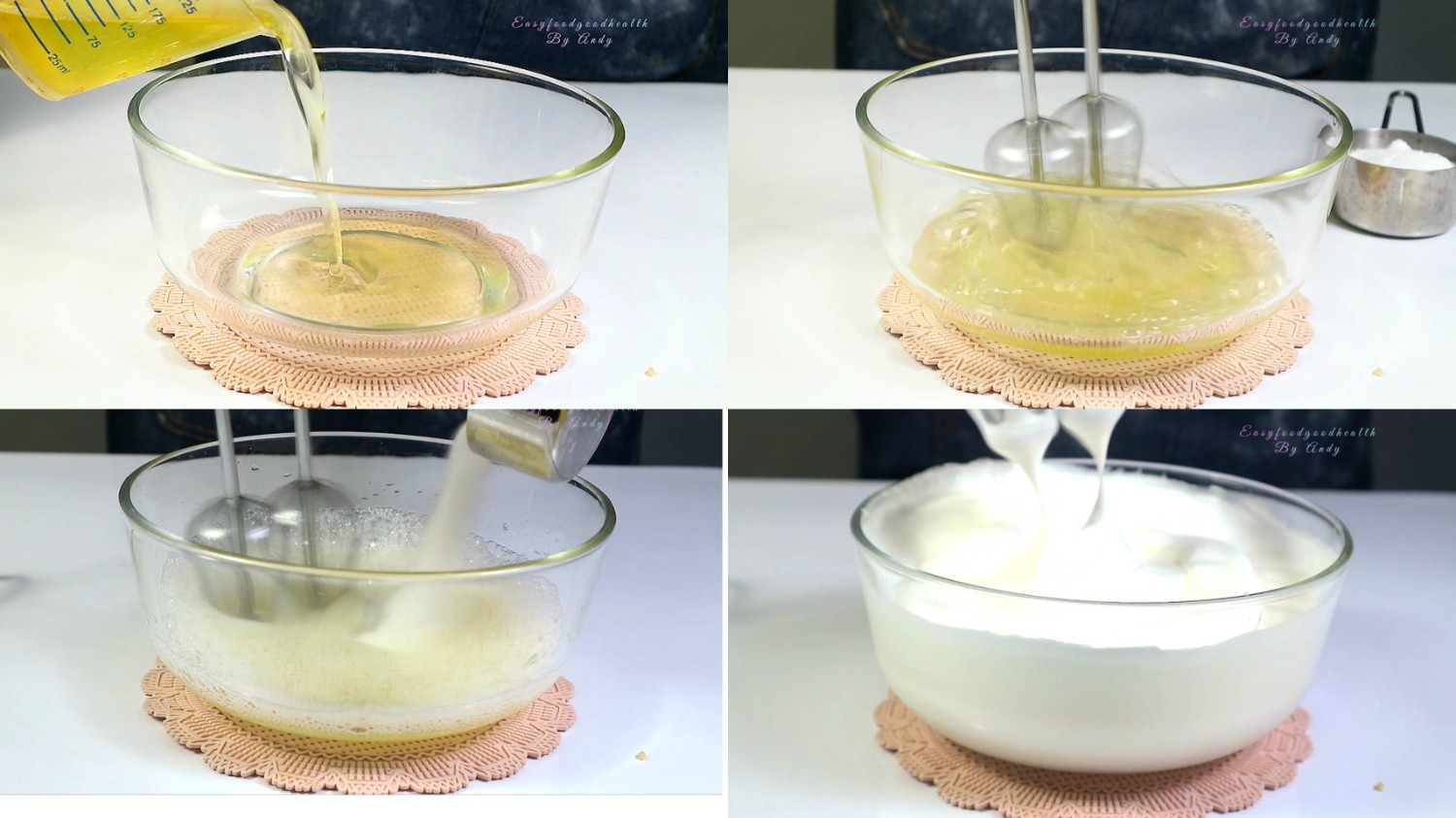 ใส่น้ำมะนาวลงไปจากนั้นปรับเป็นสปีดกลางตีต่อเนื่องให้สม่ำเสมอ ระหว่างตีแบ่งใส่น้ำตาลทราย ลงไปสามรอบตีจนตั้งยอด