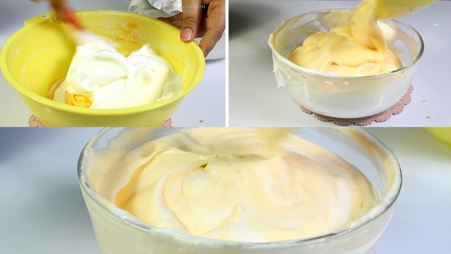 3.แบ่งเมอแรงต์ลงไปผสม คนจนเข้ากันด้วยตะกร้อหรือไม้พาย