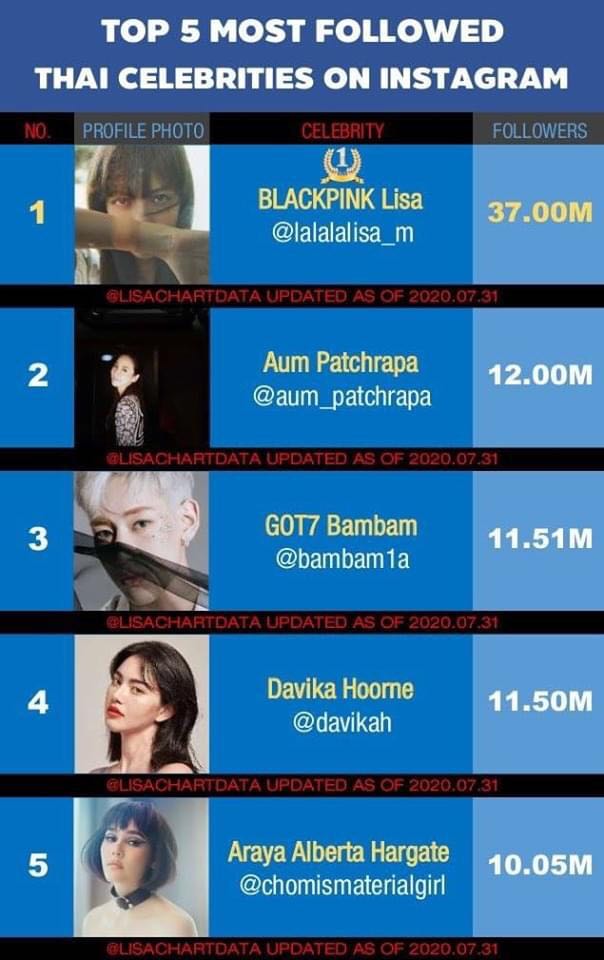 BLACKPINK's LISA มียอดผู้ติดตามบน Instagram ผ่าน 37 ล้าน Followers เรียบร้อย และเป็น Account ส่วนตัวที่มียอดผู้ติดตามมากที่สุดในลำดับที่ 1 ของอุตสาหกรรมบันเทิงของเกาหลีใต้ โดยลำดับที่ 2 - 4 ก็เป็นสมาชิกของวง BLACKPINK ได้แก่ JENNIE, ROSE, JISOO ตามลำดับ 🎉🎉🎉🎉