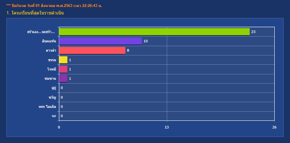 ตามกราฟเลยนะครับผม ผู้นำนี่ไปลิ่วๆ ไม่รอใครแล้วนะครับ ส่วนอันดับสองเป็นม้ามืดที่น่าจับตามองไม่น้อยเลยทีเดียว กับเวลาลงคะแนนที่ยังเหลืออยู่พอสมควร ต้องบอกเลยว่า...พอลุ้นได้อยู่นะครับ พอลุ้นได้อยู่