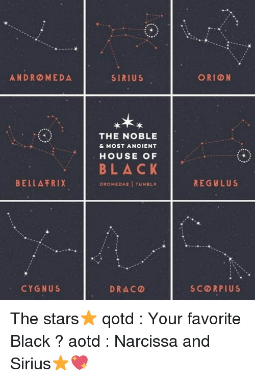 ในเรื่องแฮร์รี่ พอตเตอร์ หนึ่งในตระกูลใหญ่ที่มีความสำคัญในเรื่องนี้ ก็คงต้องมีตระกูลแบล็ก (House of Black) "ที่สูงส่งและเก่าแก่ที่สุด" รวมอยู่ด้วยแน่นอน เพราะคนในตระกูลนี้หลายคนมีบทบาทสำคัญอยู่ในเรื่อง ไม่ว่าจะเป็นฝ่ายภาคีนกฟินิกซ์หรือฝ่ายผู้เสพความตาย ซึ่งบทบาทของแต่ละคนจะเป็นอย่างไรก็คงหาอ่านกันได้ในหนังสือ แต่ที่จะมาเล่าในกระทู้นี้คือ ที่มาของชื่อบุคคลในตระกูลนี้บางคน ซึ่งมีที่มาจากชื่อของดาวหรือกลุ่มดาวบนท้องฟ้า จนสงสัยว่าบรรพบุรุษของตระกูลนี้น่าจะเป็นนักดาราศาสตร์ เลยตั้งชื่อลูกหลานเป็นชื่อของดาวหรือกลุ่มดาวเสียมากมายหลายชื่อ มีใครกันบ้าง มาลองดูกัน