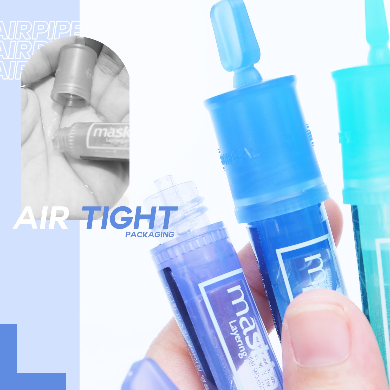 แพคเกจ เป็นหลอดพลาสติกฝาหมุนทรงเหมือนเข็มฉีดยา สีตามแต่ละสูตร และด้านในถูกออกแบบให้เป็นระบบ Airtight Cap เพื่อป้องกันการปนเปื้อนจากอากาศภายนอกมาสัมผัส โดยการใช้ท่อ Air pipe เล็กๆ คล้ายหลอดน้ำหมึกในปากกา ให้สามารถหยดเนื้อออกมาได้
