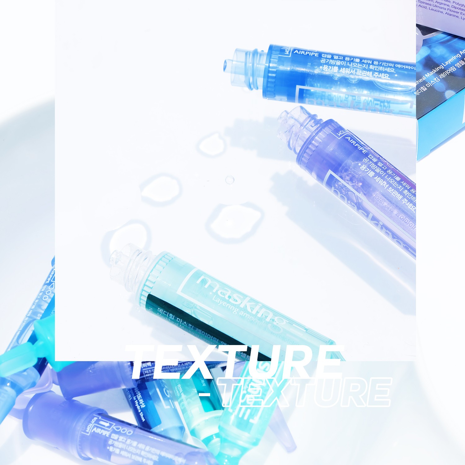 เนื้อสัมผัส โดยรวมทั้ง 3 สูตร เนื้อเหลวใส ไม่มีสี คล้ายเนื้อมาสก์ทั่วไป มีกลิ่นหอมอ่อนๆ คาดว่าจากสารแอคทีฟบางตัวที่เป็นน้ำมันหอมระเหยในตัวแทนน้ำหอม เพราะทุกตัวเขาไม่ใส่น้ำหอม พอลง 3 ชั้นจะให้ความรู้สึกไม่ต่างเหมือนตอนดึงแผ่นมาสก์ออก ประมาณว่า ให้ฟีลลิ่งแอบคล้ายกับการมาสก์ปกติ แค่หน้าตาต่างกัน และไม่เหนียวเหนอะหนะ สบายผิว หลังซึมซักพักสามารถลงสกินแคร์ต่อได้เลย