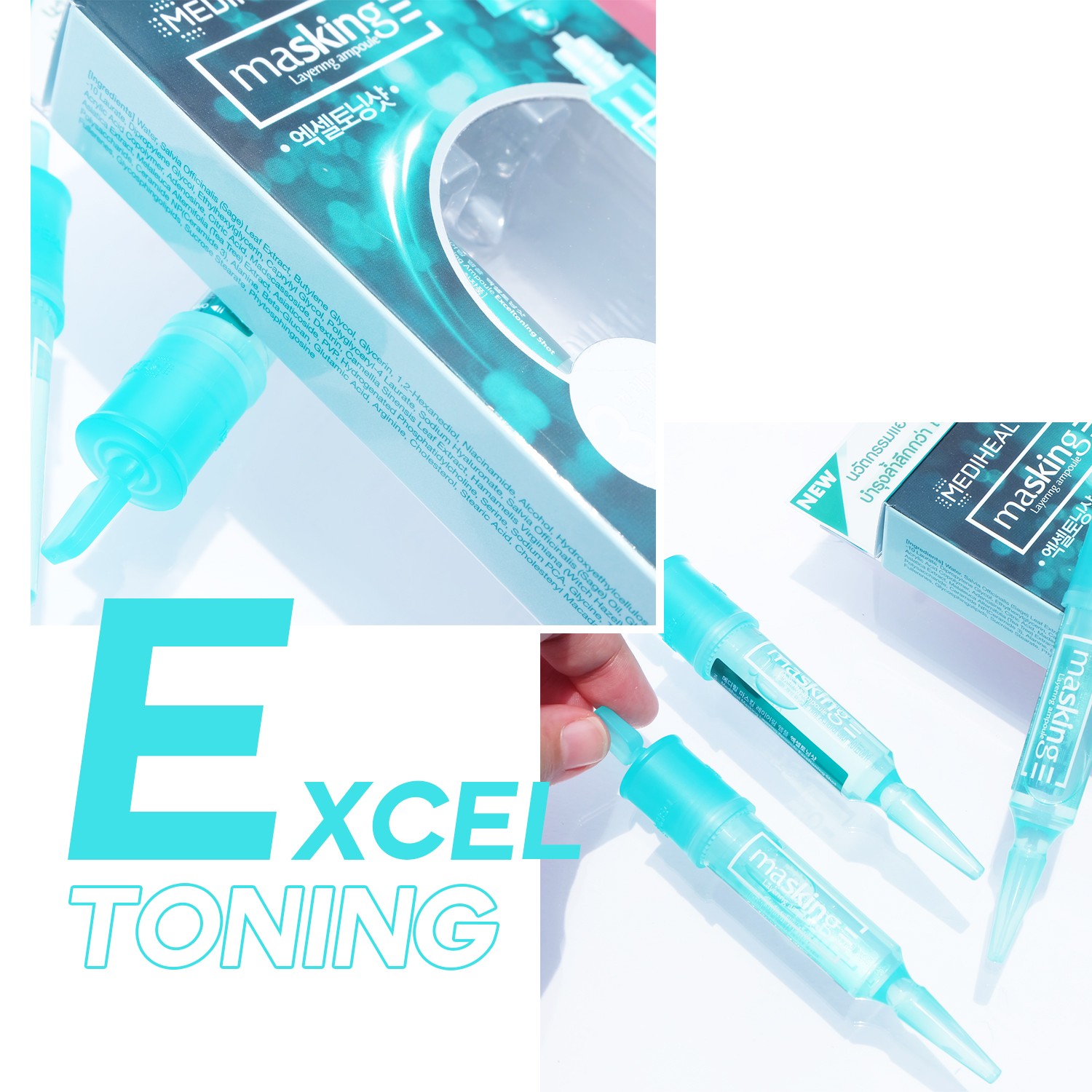 - สีเขียว Exceltoning : ลดปัญหาสิว-รอยดำรอยแดง ปรับผิวให้แข็งแรง และปรับผิวกระจ่างใส