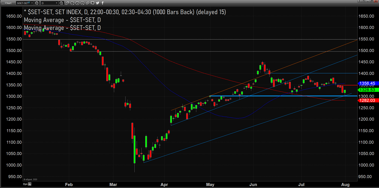 สัปดาห์สั้นๆที่ผ่านมาเนื่องจากวันหยุด SET ร่วงลงสู่แนวรับที่สำคัญที่ 1301 จุดต่ำสุดของวันศุกร์ที่ 1303 ก่อนที่จะดีดตัวขึ้นเล็กน้อยเพื่อปิดที่ 1328 เราไม่ควรสนใจมากเกินไปว่าเรากำลังทำจุดสูงสุด และจุดต่ำสุดที่ตํ่าลง (lower high & lower low) แต่ 1301 มีไว้สำหรับทุกคนที่ยังคงมีหุ้นในพอร์ตที่จะทําให้สบายใจ