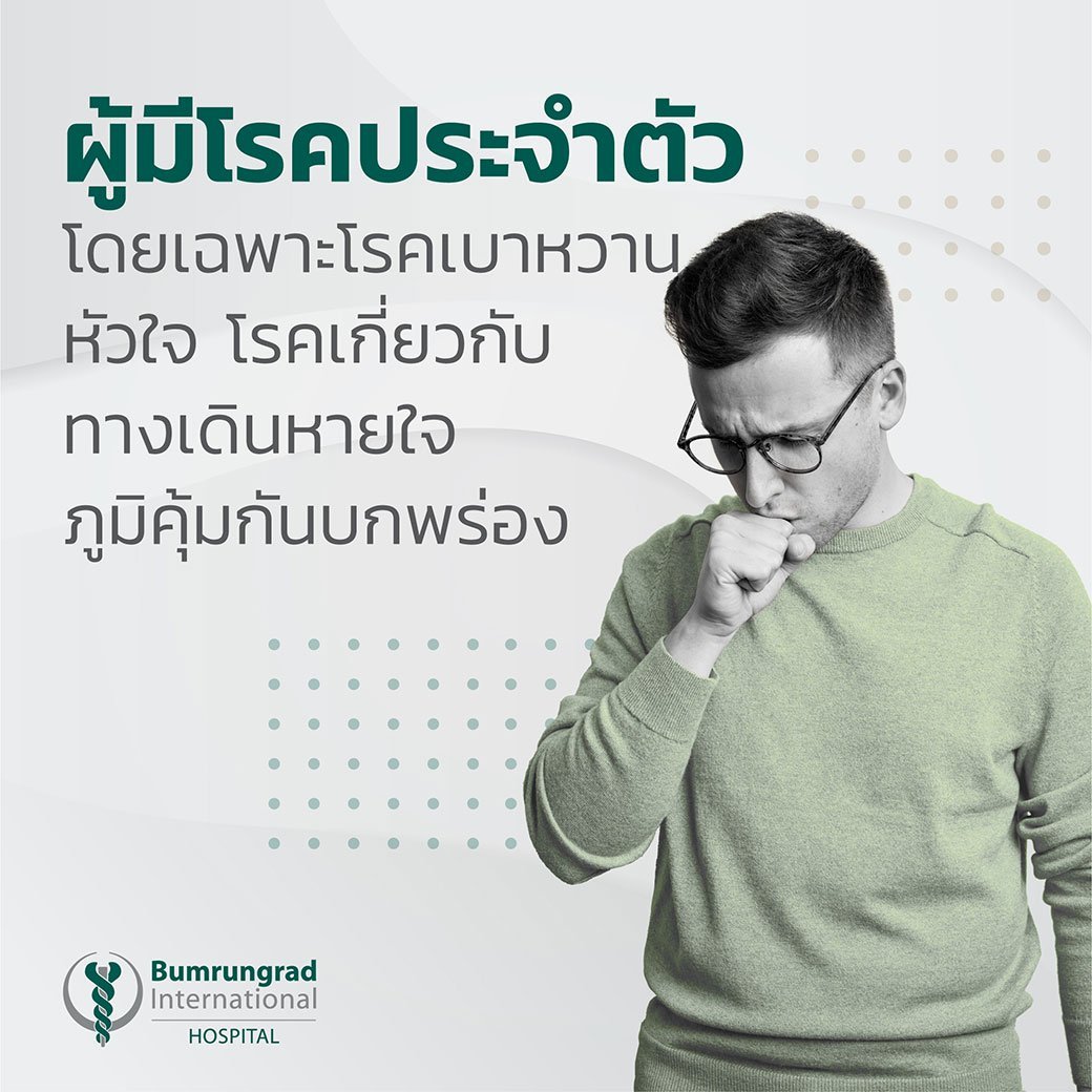- ผู้มีโรคประจำตัว โดยเฉพาะโรคเบาหวาน หัวใจ โรคเกี่ยวกับทางเดินหายใจ ภูมิคุ้มกันบกพร่อง