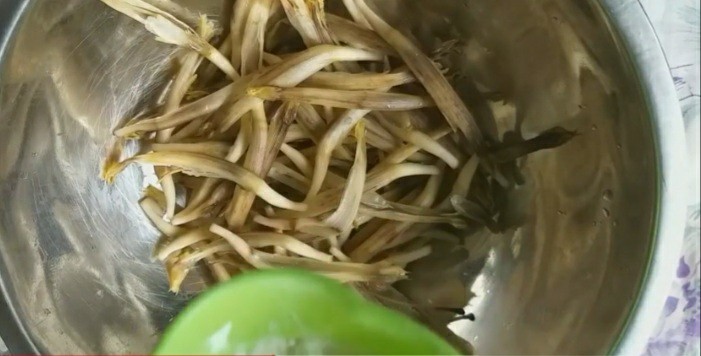 นำเกสรหัวปลีมาล้างน้ำเกลือ แล้วพักให้สะเด็ดน้ำ