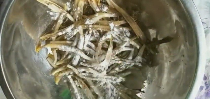 4.นำแป้งทอดกรอบโรยบนดอกปลีกล้วย แล้วนำมาชุบแป้งที่เตรียมไว้ลงไปทอดในน้ำมัน ให้เหลืองกรอบ