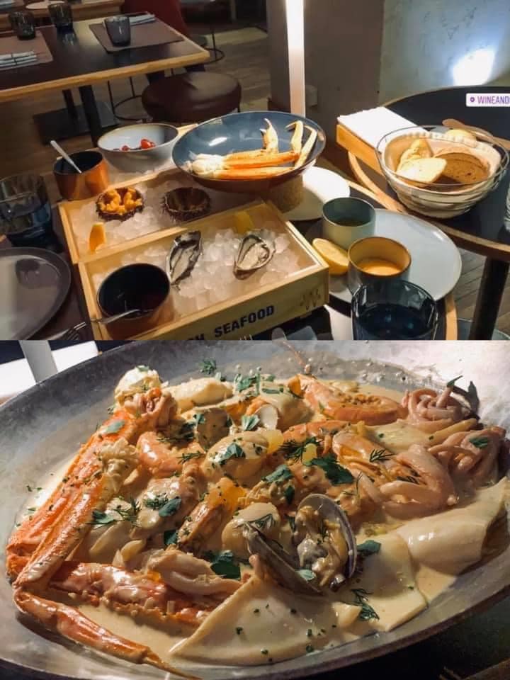 นั่งแทะปูกับขนมปังไปจนจะหลับอีกรอบสักพัก จานหลักเราก็มาแล้วจำไม่ได้ว่ามันเรียกว่าอะไร แต่บอกเลยต้องกิน!!!!! อร่อยตาแตกมากแถมมาทั้งกระทะค่ะ เป็นรวมซีฟู้ด หมึก กุ้ง หอย ปู ผัดกับ cream sauce ทานด้วยกันแล้วมันแบบเห็นพลุปุงปังช่างเข้ากันจริงๆ