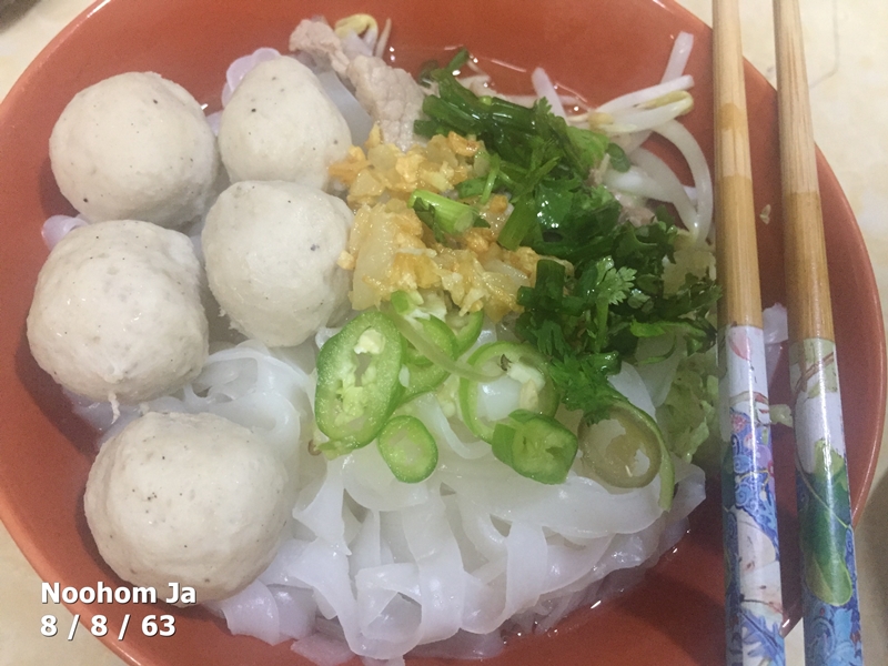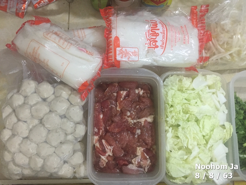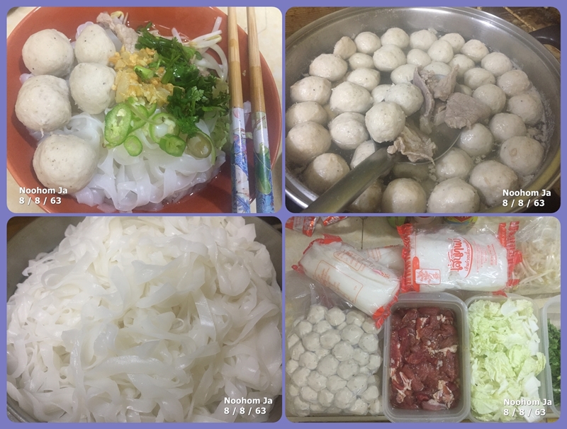 วันหยุดต้นเดือน สมาชิกอยู่กับบ้านอาหารถูกปากทานกันได้ทุกคนราคาประหยัดง่ายต่อการทำ ก๋วยเตี๋ยวลูกชิ้นหมู วัตถุดิบมีไม่กี่รายการตามประสาบ้านๆ เส้นก๋วยเตี๋ยว ลูกชิ้น หมูเนื้อสัน ผักกาดขาว ถั่วงอก พริกหนุ่มทำพริกน้ำส้ม เครื่องปรุงอย่างอื่น เกลือ น้ำตาล น้ำปลา พอหลงเหลือติดบ้าน แค่นี้ก็พอจะเป็นก๋วยเตี๋ยวแห้ง ก๋วยเตี๋ยวน้ำใสได้แบบไม่ต้องครบเครื่อง