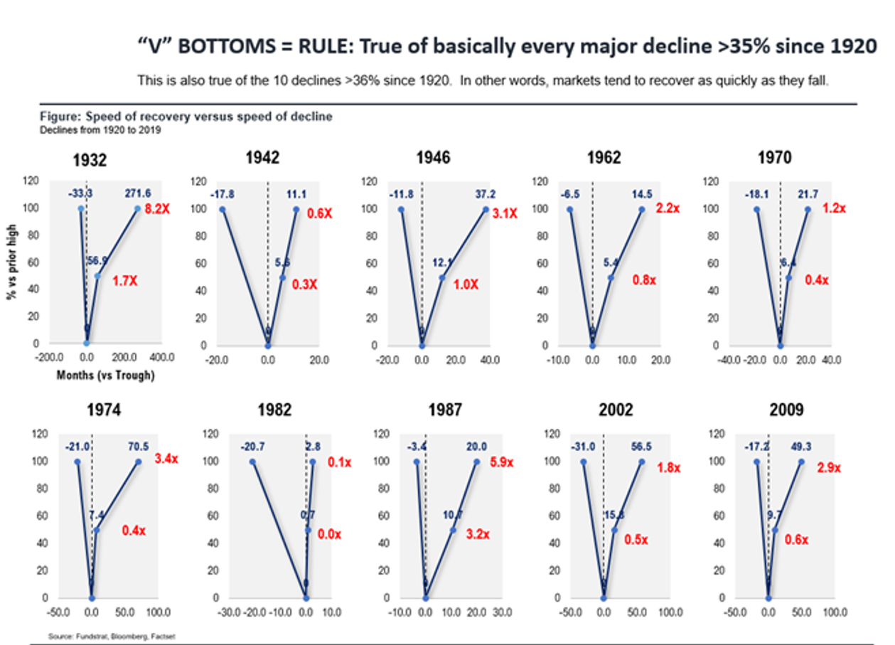 “ ตั้งแต่ปี 1920 ทุกตลาดหุ้นที่ลดลง> 35% ทำให้ราคาฟื้นตัวอย่างสมมาตร กล่าวอีกนัยหนึ่งคือยิ่งตลาดตกเร็วเท่าไหร่ตลาดก็จะฟื้นตัวเร็วขึ้นและอัตราส่วนคือ 2.5X เมื่อพิจารณาถึงความเร็วของปี 2020 สิ่งนี้บ่งบอกถึงการทำจุดสูงสุดใหม่ก่อนสิ้นสุดฤดูร้อน”