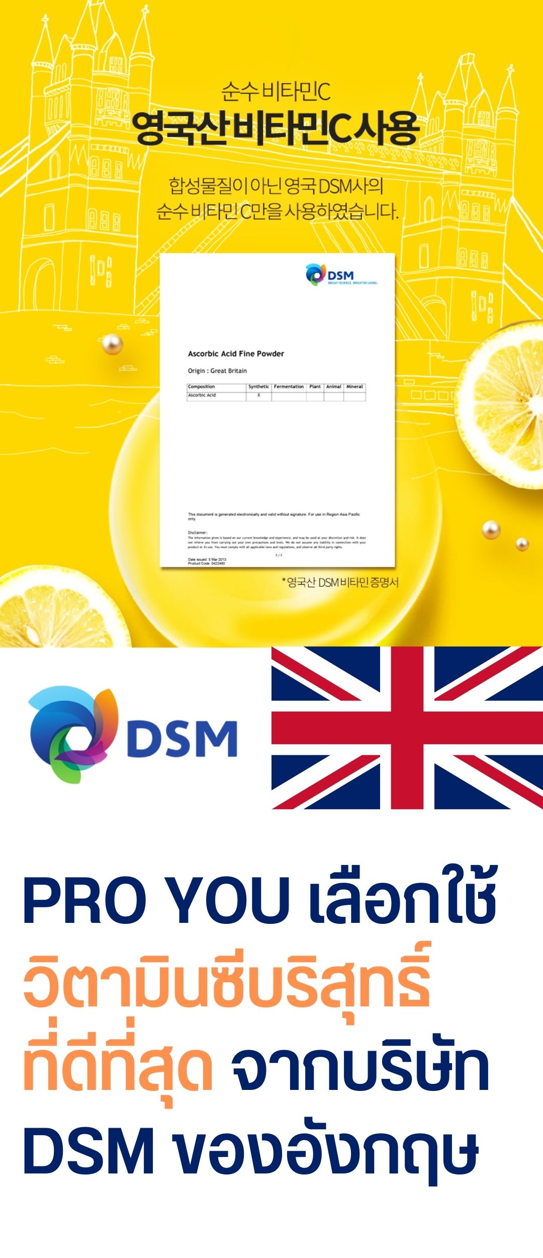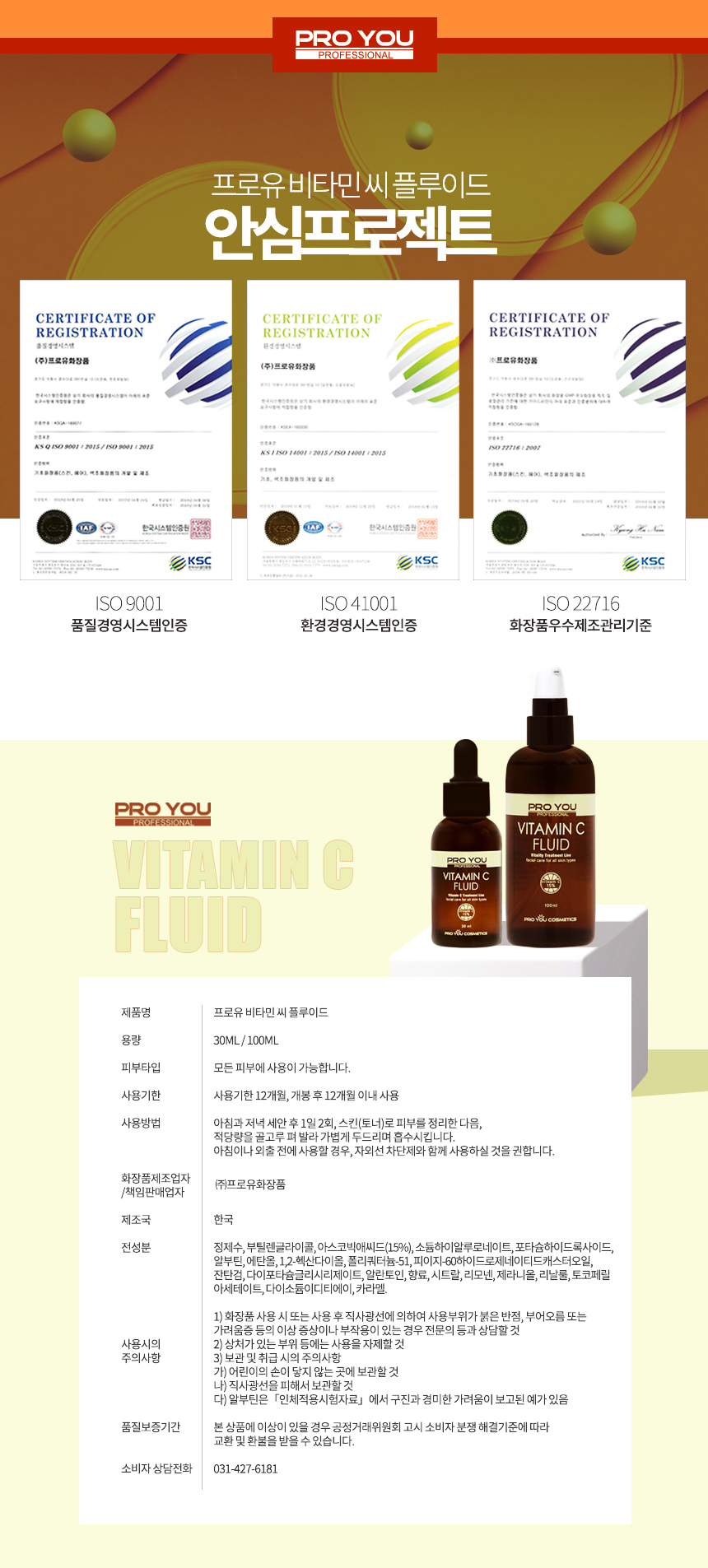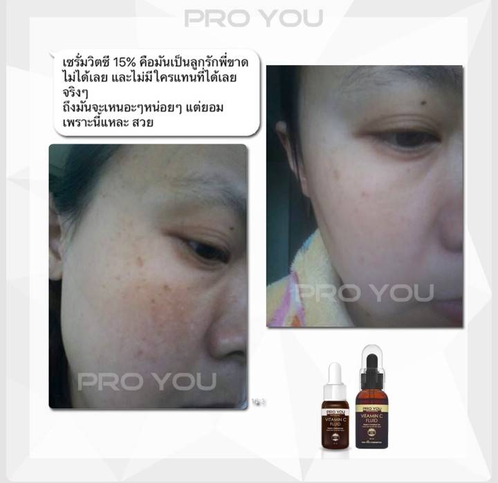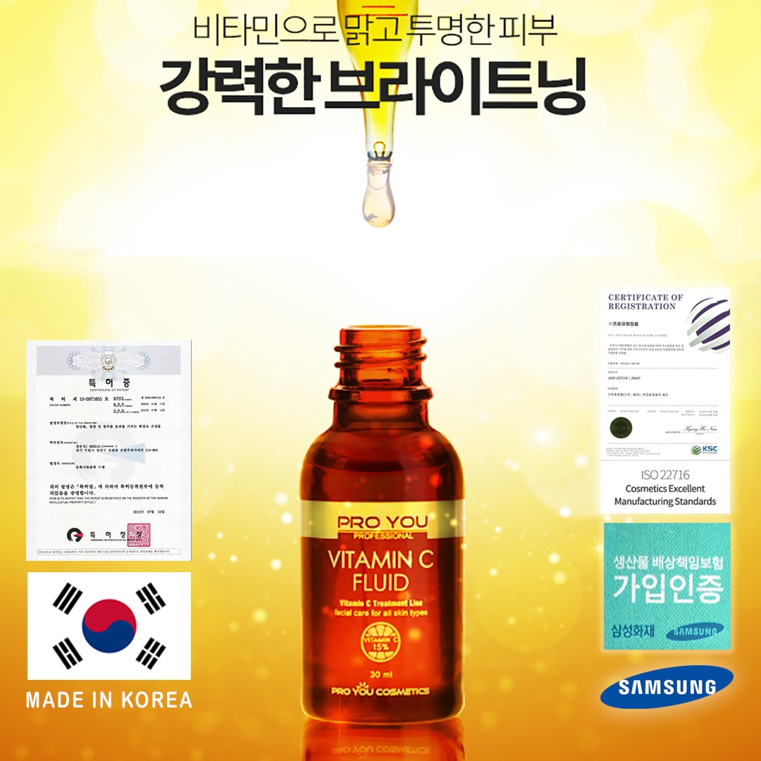 ผลิตภัณฑ์เซรั่มวิตามินซี Proyou Made in korea ใช้วิตามินซีสูตรคงตัว เข้มข้น 15%(เยอะมากในบรรดาเซรั่มวิตามินซี - และยังมีแบบผงผสม 100%) โดยสูตรเซรั่มจะใช้ฟอร์มของวิตามินซีธรรมชาติที่ซึมซาบเร็ว (Ascorcic Acid) และสูตรครีม ที่จะใช้วิตามินซีฟอร์มที่คงตัวที่สุด (Magnesium Ascorbyl Phosphate , MAP) เป็นเวชสำอางที่ได้รับการยอมรับจาก KFDA (อ.ย. เกาหลี) ได้มาตรฐานการผลิตโลก ISO 14001/9001 ได้รับตรารับรองคุณภาพจาก Samsung ผู้การันตีสิ่งที่ดีที่สุดของเกาหลี