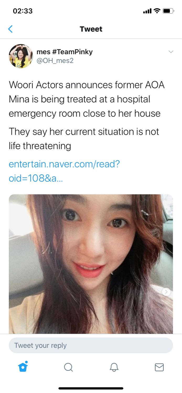 คือ....แบบ พูดไม่ออกอะ สภาพจิตใจมินอา ตอนนี้คงแย่มากๆ ถึงขั้นกรีดข้อมืดตัวเองแล้วก็ลงรูปในไอจี แต่ตอนนี้ลบแล้ว (ขอไม่ลงรูปนะ) ใครอยากเห็นลองไป