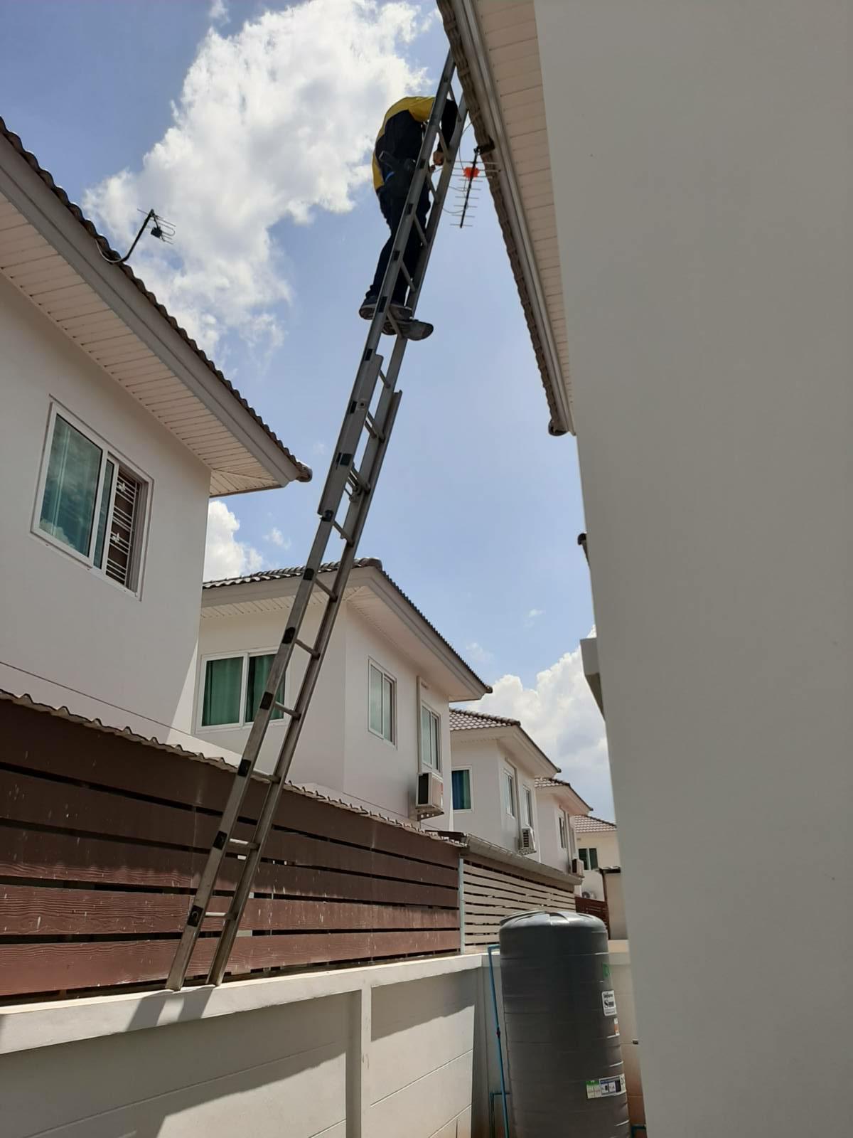 บ้านโครงการ ได้เดินสายสัญญาณโทรทัศน์ภายในผ่านกล่องแยกสัญญาณแล้ว ไปยังจุดต่างๆภายในบ้าน 5 จุด โดยมีปลายสายห้อยทิ้งไว้ บนชายคาบ้าน ในทางทฤษฏี ถ้าเราเอาเสาอากาศมาเชื่อมต่อกับสายสัญญาณตรงชายคาแล้ว และหัน