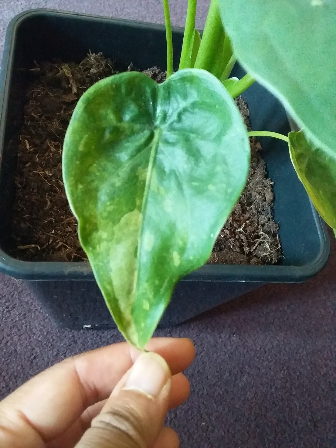 ลักษณะใบเป็นรูปหัวใจ มันเงา ใบด่างเล็กน้อย