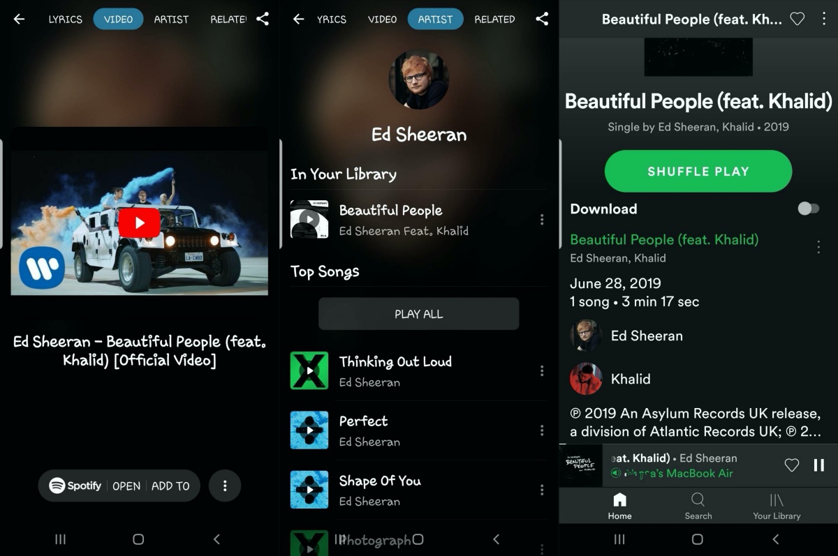 มีเมนูย่อยให้เลือกดูเนื้อเพลง (Lyrics) , เลือกดูมิวสิควิดีโอจะลิงก์ไปที่ Youtube , เลือกดูรายการเพลงของศิลปิน จะมีรายชื่อเพลงที่อยู่ใน Shazam ทั้งหมด และเลือกฟังเพลงแบบเต็มๆ ผ่านแอปที่เราเชื่อมต่อไว้ อย่าง Spotify ได้อีกด้วย