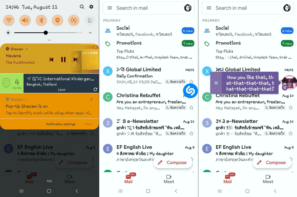แอป Shazam ยังสามารถเปลี่ยนธีมเป็นสีดำ (Dark Theme) และยังมีฟังก์ชั่น Pop-up หน้าต่างเพลย์ลิสต์ของ Shazam ใช้ฟังเพลงและดูเนื้อร้องได้ ในระหว่างใช้งานแอปอื่นค่ะ
