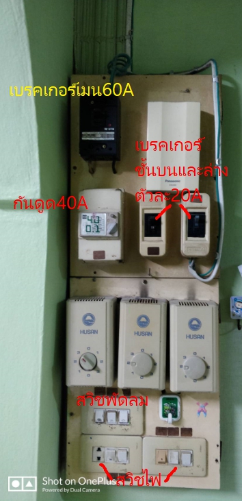 ของเดิมก่อนนะครับ มิเตอร์ไฟ 15(45)A - เมนเบรคเกอร์ 60A - กันดูด 40A - เบรคเกอร์คุมไฟชั้นบน และชั้นล่าง ตัวละ 20A มีการเดินสายดินเพิ่มในบางจุดไปให้กับเครื่องทำน้ำอุ่น และเครื่องซักผ้า(สายสีเขียว)