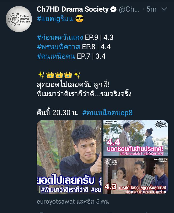 #แอดเgรียน 😎 #ก่อนตะวันแลง EP.4 l 4.2 #พรหมพิศวาส EP.6 l 4.7 📈 ✨👑👑💋✨ วงพวกเราทำได้!!! ครบเครื่องครบรส...กำลังใจมาเต็ม คืนนี้ 20.30 น. ผนึกก