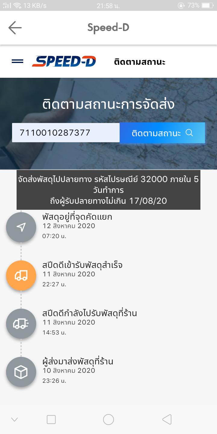 อยากทราบว่าบ.speed dส่งของช้าทุกพื้นที่หรือปล่าวคะ ปกติขนส่งอื่นต้องมาส่งแล้ว แต่นี่รอเกิน3วันแล้วค่ะ ยังไม่ได้ของเลย😂