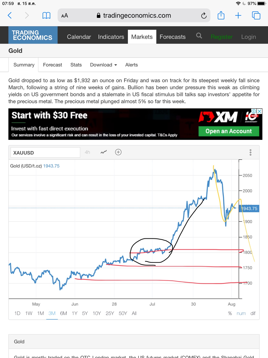 ทองหลังจากสตารท ที่วงดำ ก้ลากยาว จนตีโค้งผ่านจุดพีค