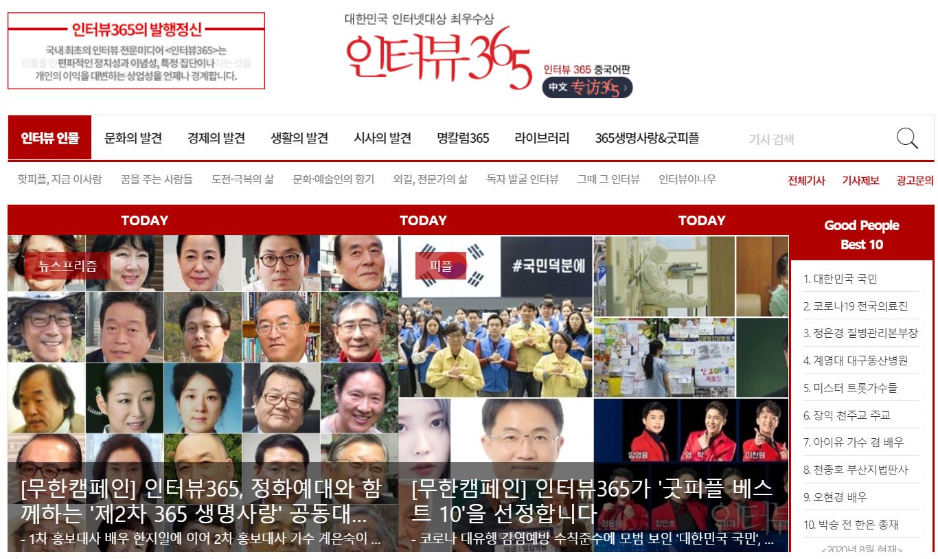 เนื่องในวันเฉลิมฉลองครบรอบ 13 ปีการก่อตั้งและเพื่อรำลึกถึงวันแห่งการปลดปล่อยในวันที่ 15 สิงหาคม 2020 ซึ่งเป็นช่วงที่ประวัติศาสตร์สมัยใหม่ของเกาหลีเริ่มต้นขึ้น ในแต่ละปีทาง Interview 365 จะทำการคัดเลือกและประกาศบุคคลที่ดีที่สุด 10 บุคคลที่เป็นที่รักและกลายเป็นแบบอย่างให้กับคนจำนวนมากในฐานะบุคคลที่เป็นผู้นำในด้านต่างๆของเกาหลี เช่น ศิลปะวัฒนธรรมการท่องเที่ยว การจัดการทางวิชาการ ศาสนา สังคม และการเมือง ฯลฯ