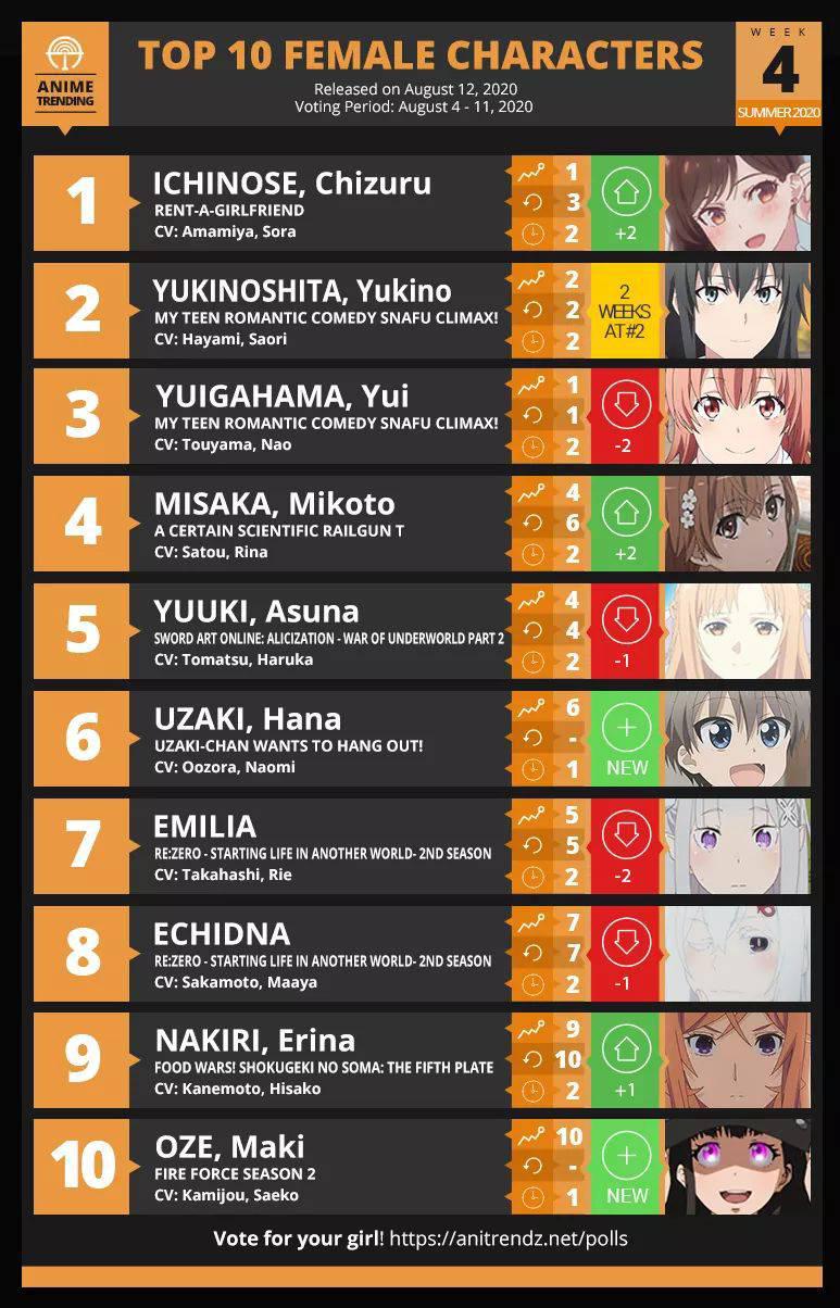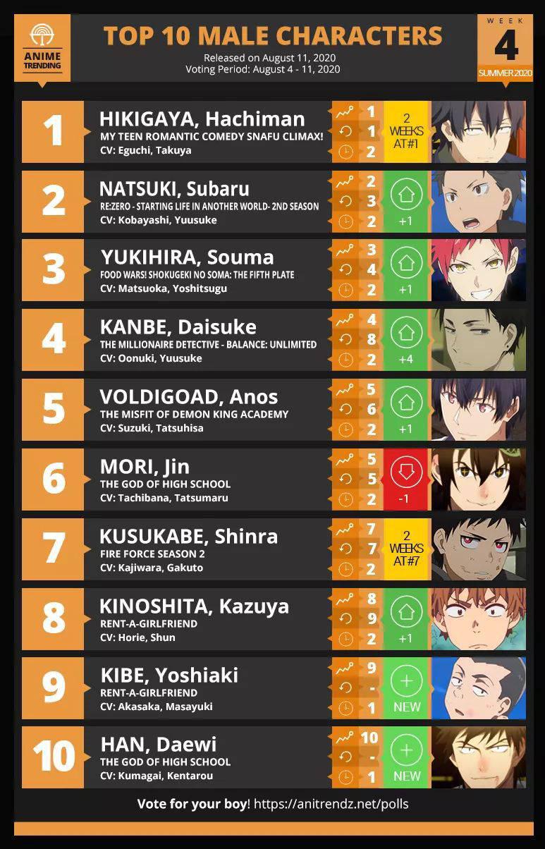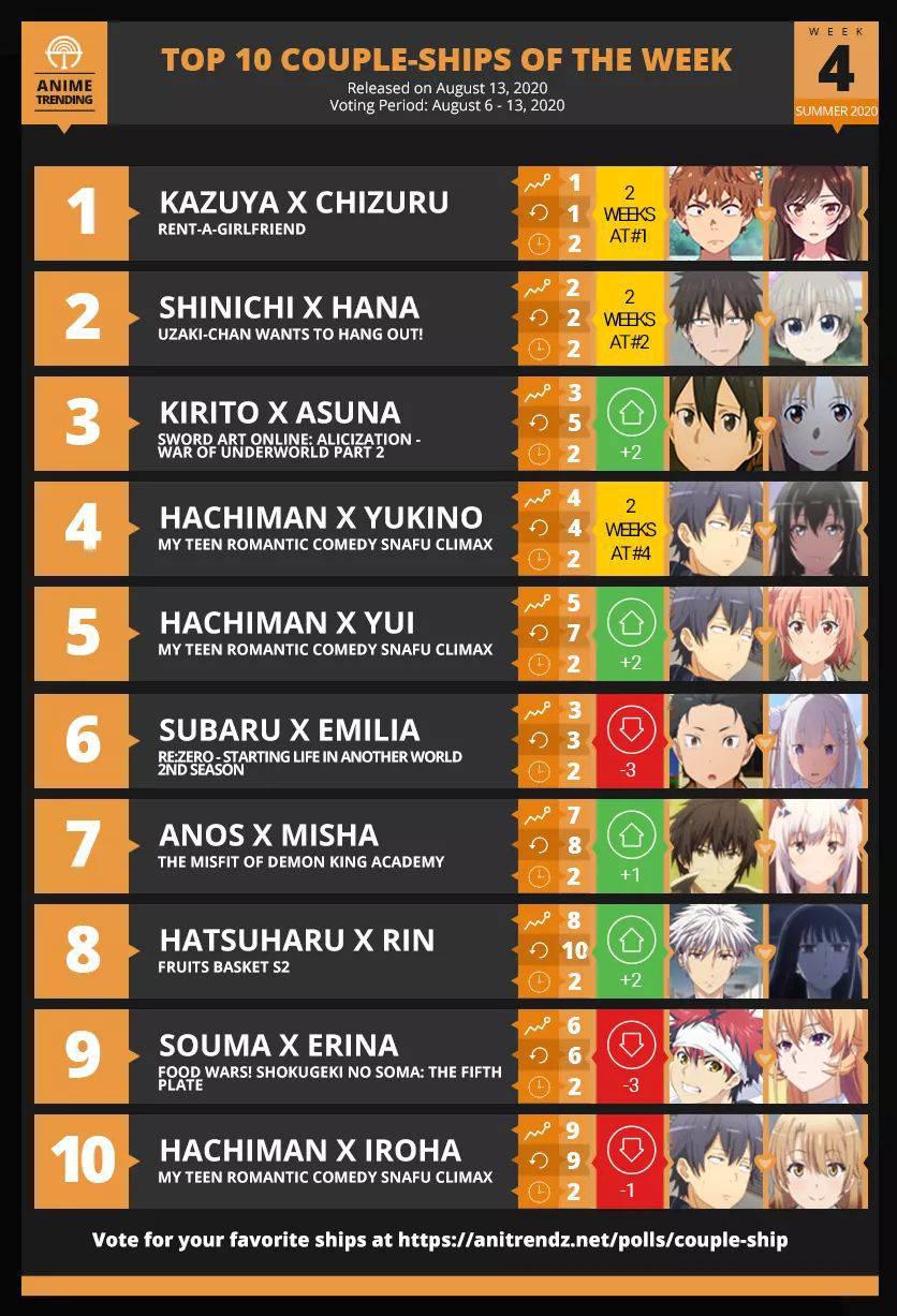 อันดับอนิเมะมาแล้วค่ะ ได้ข่าวว่าโตะกลับมาแล้ว อันดับพุ่งไปเยอะเลย ตัวละคร ชาย กลับมาที ยึดหัวแถวเลย หญิง คู่ชิป ชอบใครเชียร์ใครไปโหวตกันได้นะคะ https://anitrend
