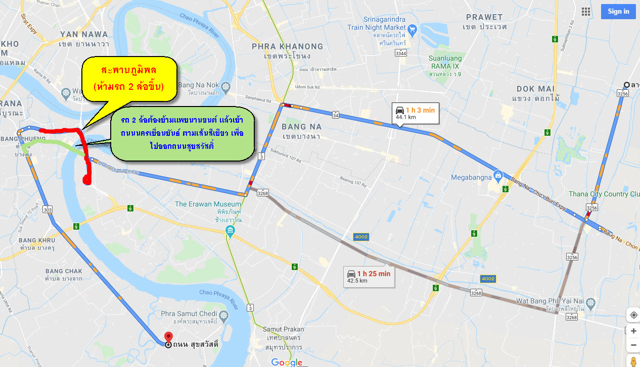 ส่วนสะพานภูมิพล (ตามเส้นสีแดง) ที่จริงแล้วเป็นสะพานที่ห้ามรถต่ำกว่า 4 ล้อขึ้น แต่ในความเป็นจริงแล้วก็มีรถ 2 ล้อขึ้นไปใช้อยู่เรื่อยๆ