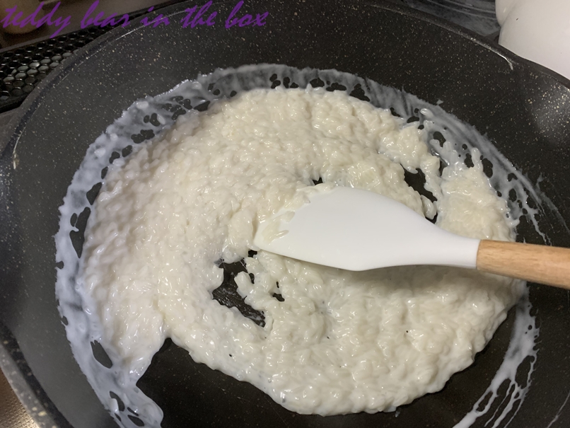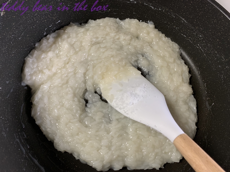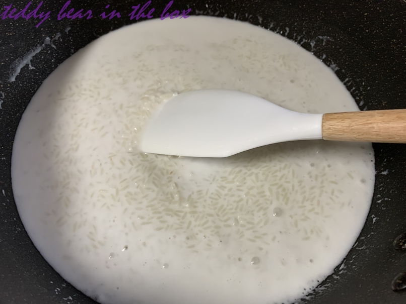 ใส่น้ำตาลลงไปกวนจนเข้ากันดี ตอนนี้ตัวข้าวเหนียวเป็นมันวาว สวยงาม