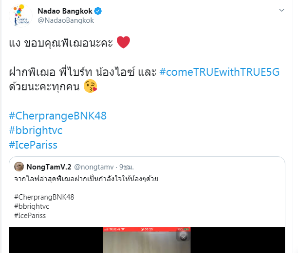 แอดมินนาดาวน่ารักมากๆ ออกมาขอบคุณเฌอที่ช่วยเป็นกำลังใจให้เด็กในค่ายตัวเองอย่าง ไอซ์ พาริส รวมถึงนอกสังกัดอย่าง GMMTV อย่างไบร์ทด้วย