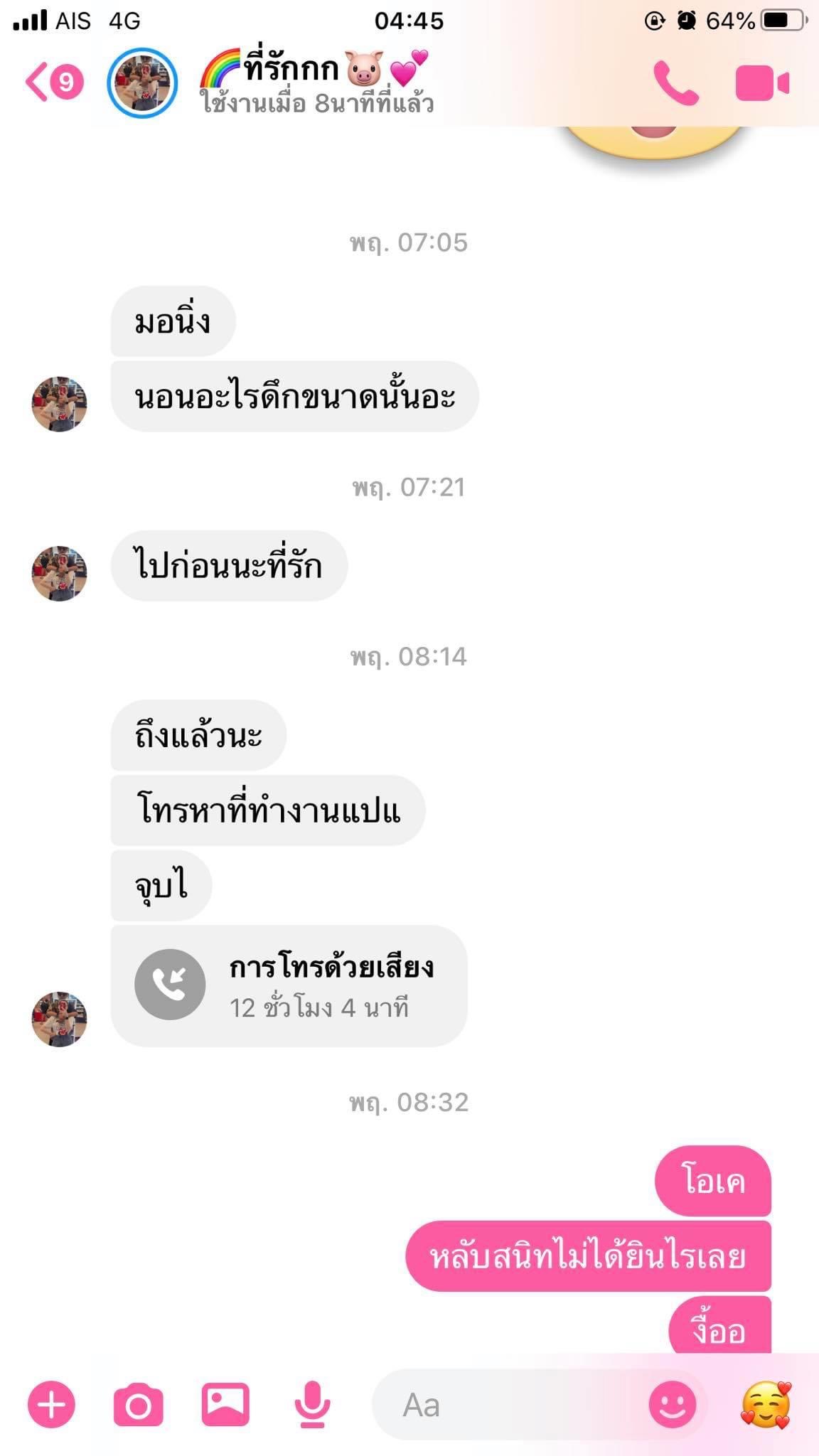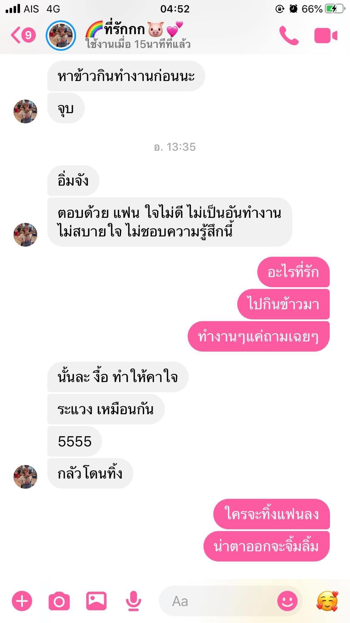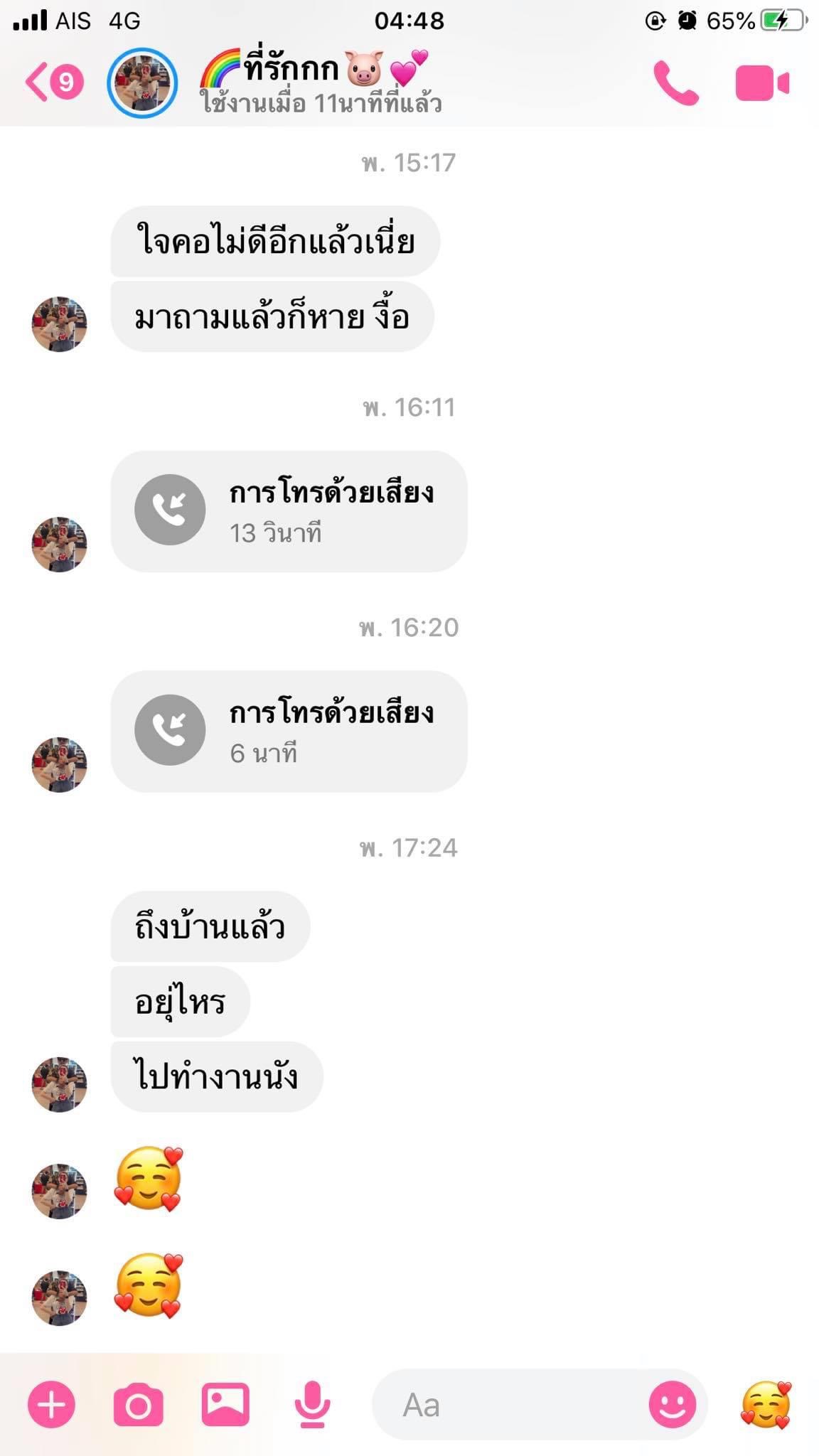 เขาดูรักเรามาก ไม่รู้ว่านี่เข้าข้างตัวเองเกินไปไหม แต่เขาเป็นแบบนี้จริงๆ ขับรถกลับบ้านถ้าทะเลาะกันจะต้องจอดพิมพ์ก่อน ให้เข้าใจ หรือถ้าไม่เข้าใจกัน ก็จะจอดพิมพ์เป็นระยะๆ ทำงานอยู่ดีๆก็หนีมาพิมพ์ไว้เรื่อยๆ ตอนอยู่ด้วยกันเวลาดีกัน จะดูเหมือนรักมาก นอนก็จะถูกตัวเราตลอด เบียดจนจะตกที่นอน ไปไหนก็เอาเราไปด้วย ถ้าไม่ได้ไปด้วยกัน เขาบอกมันจะเฟล มันจะไม่สนุก เพราะใจเขาอยู่ที่เรา เลี้ยนอะ😌 แต่ก็ไม่มีตอนไหนเลยที่เขาไม่เอาเราไปนอกจากเราไม่ว่างจริงๆและบอกให้เขาไปคนเดียว