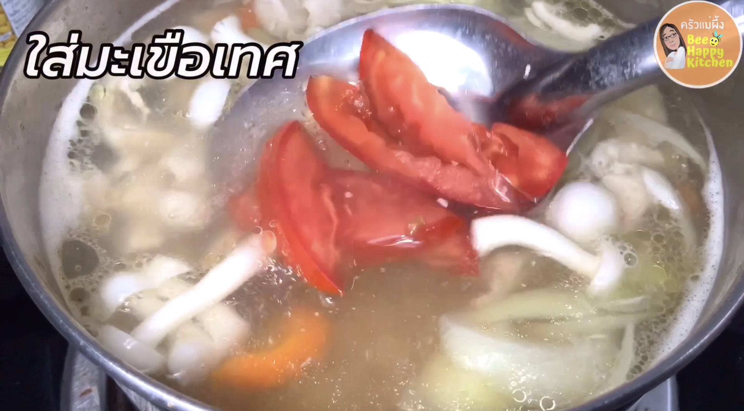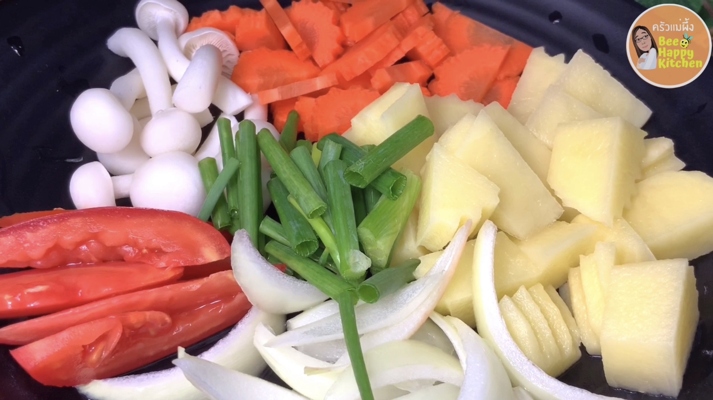 ใส่มะเขือเทศ และเห็ดเพราะเป็นผักที่สุกง่าย