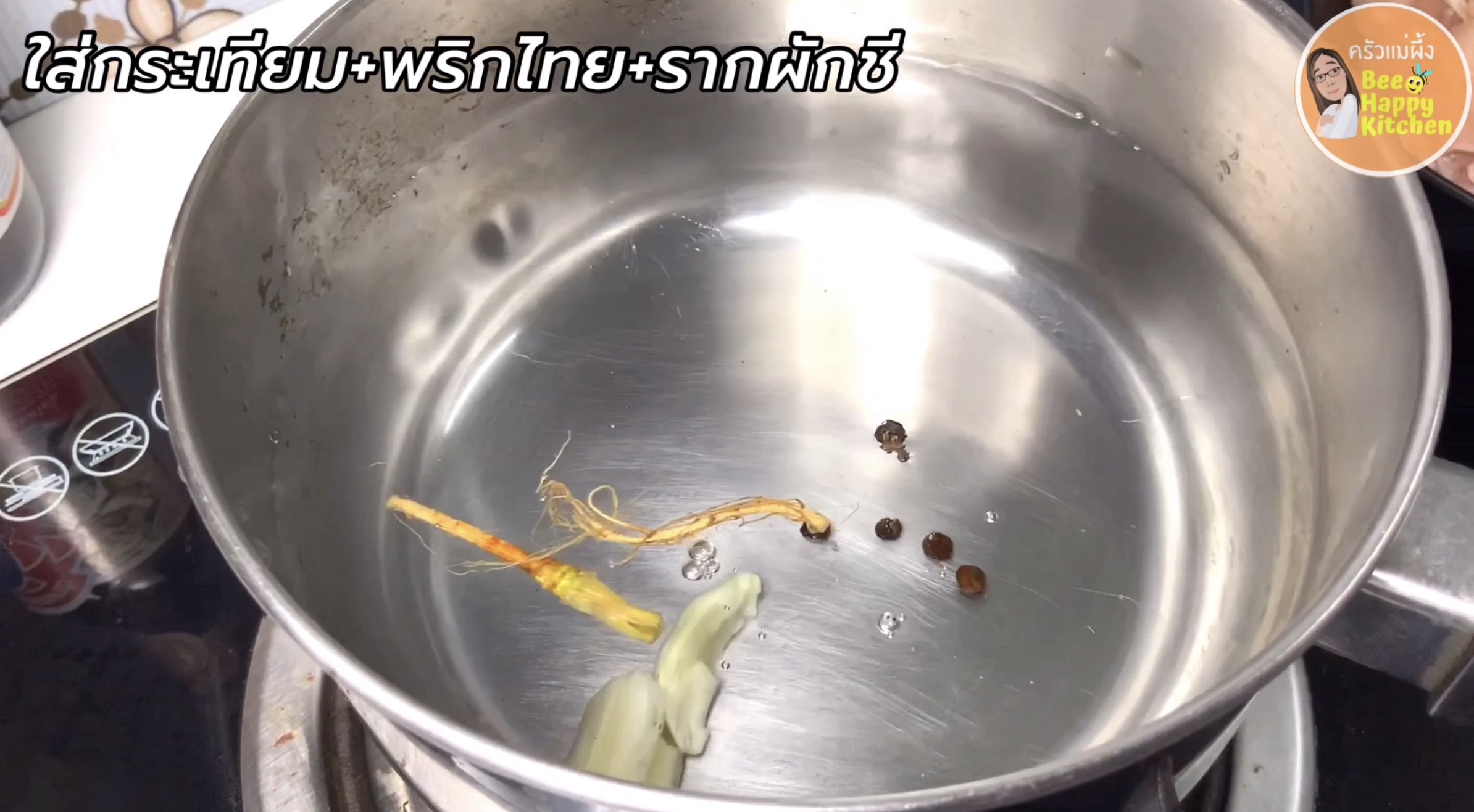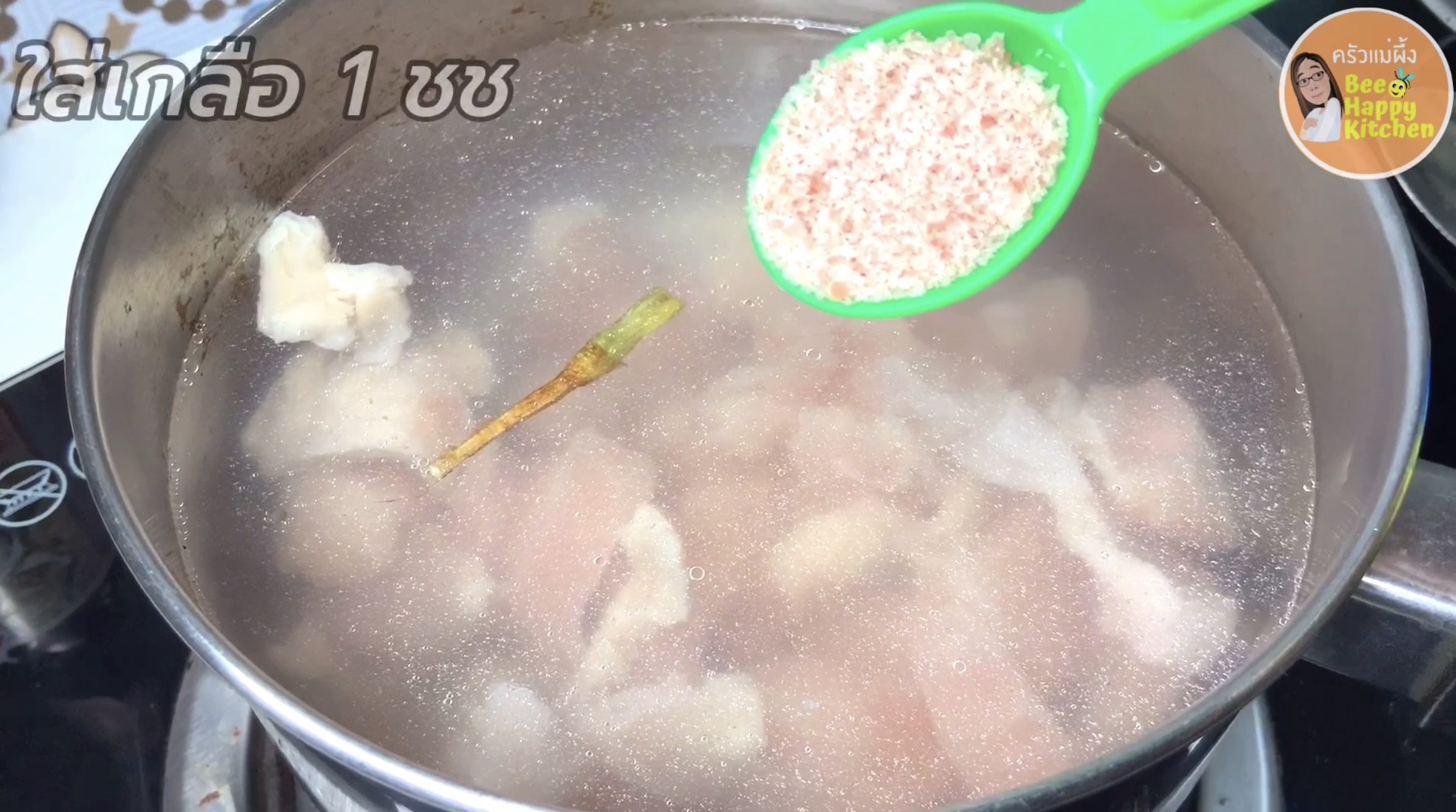 เตรียมน้ำ 1ลิตร ใส่กระเทียมพริกไทยรากผักชี เกลือ 1 ชช และเนื้อไก่ ต้มด้วยไฟอ่อนๆ เมื่อมีฟองขาวให้ช้อนฟองออก